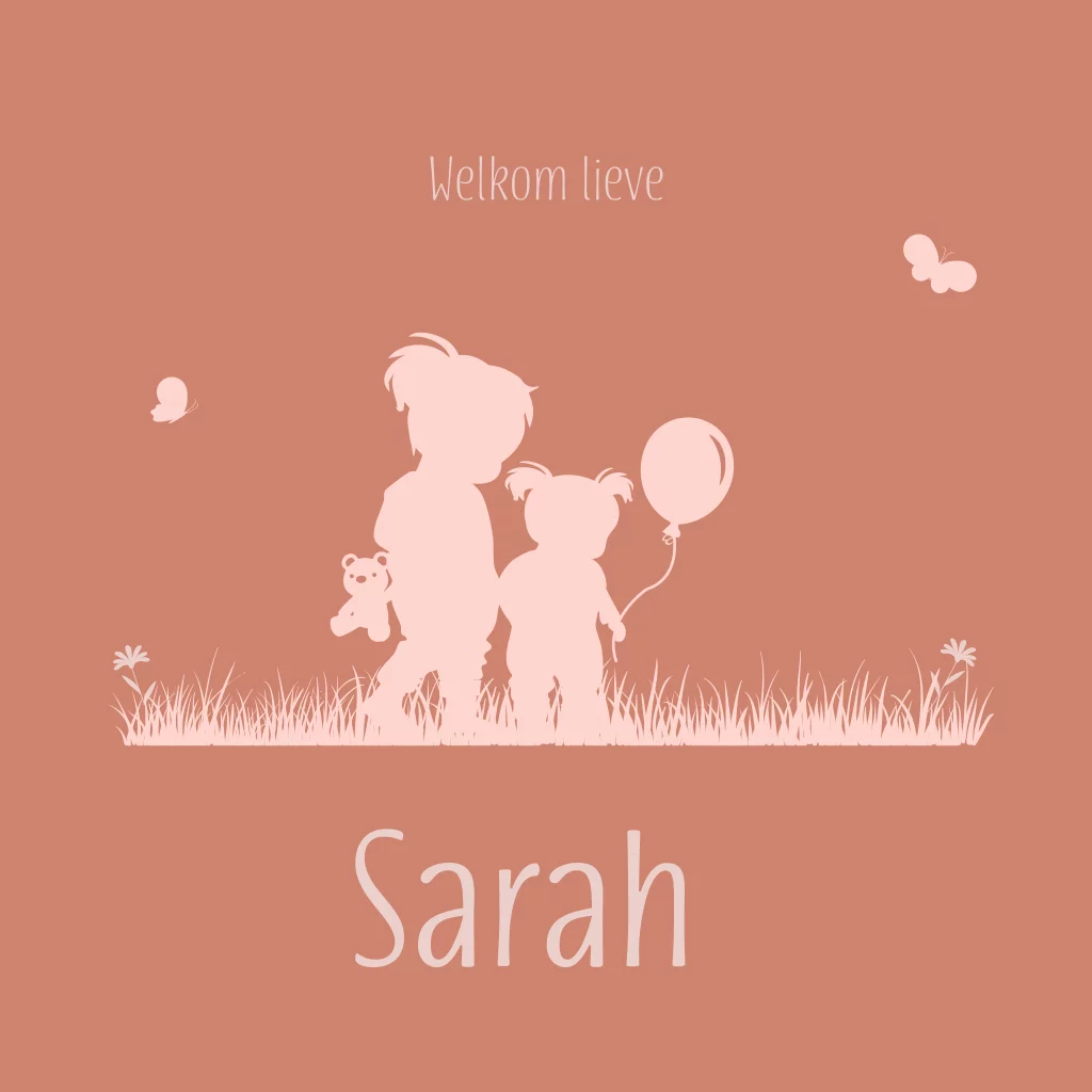 Geboortekaartje met een silhouet van 2 zusjes die aan het lopen zijn met een beer en een ballon. (24507)