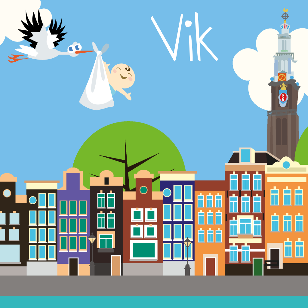Superleuk geboortekaartje voor een kleine Amsterdam. Kaarten met Amsterdamse grachten met de Westertoren van de Westerkerk. Kindjes zijn eenvoudig naar wens aan te passen in onze kaartenmaker. (7672)