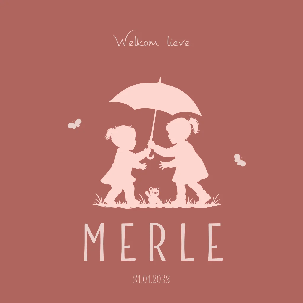 Geboortekaartje herfst voor een tweede kindje met 2 meisjes onder een paraplu. (30084) Deze kaart heeft ronde hoeken, maar kan ook met rechte hoeken ( - 0,30 per kaartje)
