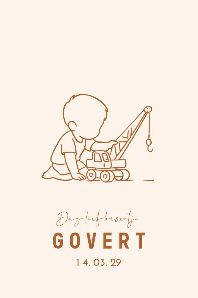 Een lief geboortekaartje voor een jongen met een subtiel lijntekening‑silhouet van een jongetje dat speelt met een hijskraan, speels en stoer tegelijk en perfect passend bij een nieuwsgierige kleine avonturier. Het ontwerp kun je eenvoudig zelf aanpassen in onze online editor. (24805)