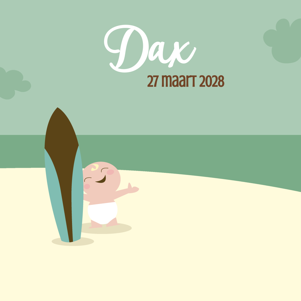 Stoer geboortekaartje met retrokleuren met een jongetje met een surfboard. Op de achtergrond het strand en de zee. (9896)