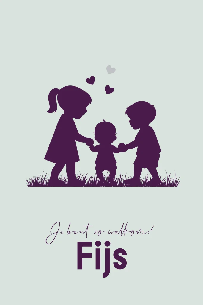 Een liefdevol geboortekaartje met het silhouet van een kindje dat leert lopen, samen met broer en zus. Het ontwerp heeft een speelse en tedere uitstraling en kun je eenvoudig aanpassen in onze online editor. (24802)