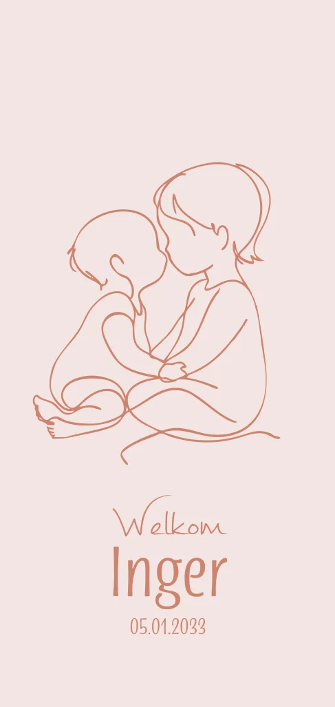 Een prachtig minimalistisch geboortekaartje met een zachte lijntekening van zusjes die elkaar liefdevol omhelzen en kussen. Het subtiele silhouet geeft een warme, intieme uitstraling. Personaliseer eenvoudig zelf de kleuren, namen en teksten in onze online editor. (24806)