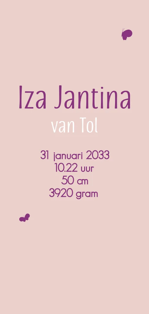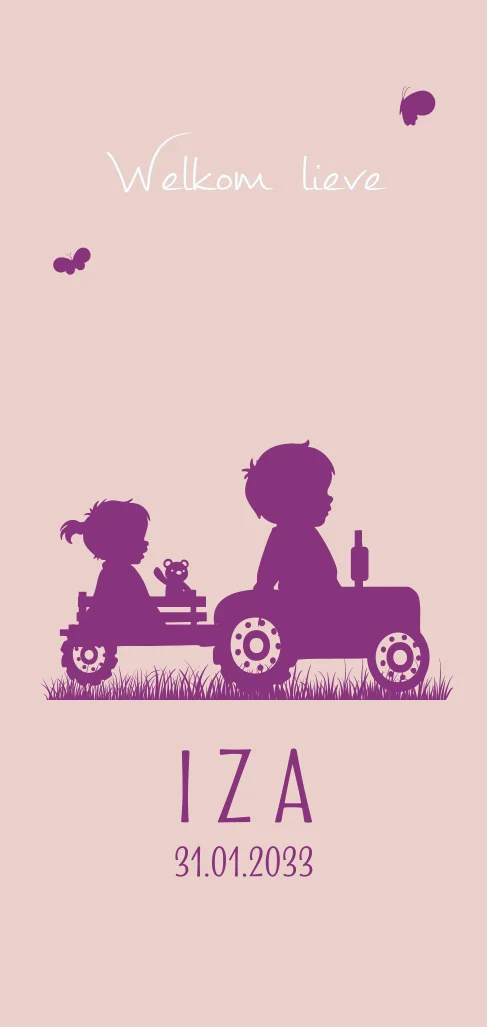 Een vrolijk en speels geboortekaartje met een stoere tractor waar grote broer en zusje op zitten, vergezeld door een lief teddybeertje. Het ontwerp heeft een kleurrijke, warme uitstraling. Je kunt alles eenvoudig zelf aanpassen in de online editor. (24801)