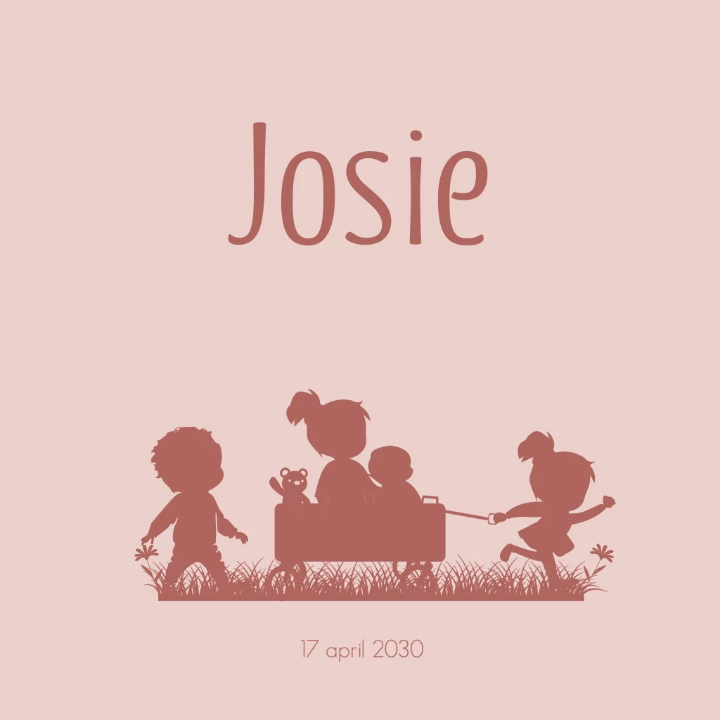 Vierde kindje geboortekaartje met een silhouet van een grote zus die haar kleinere zusjes voorttrekt in een bolderwagen (24300)