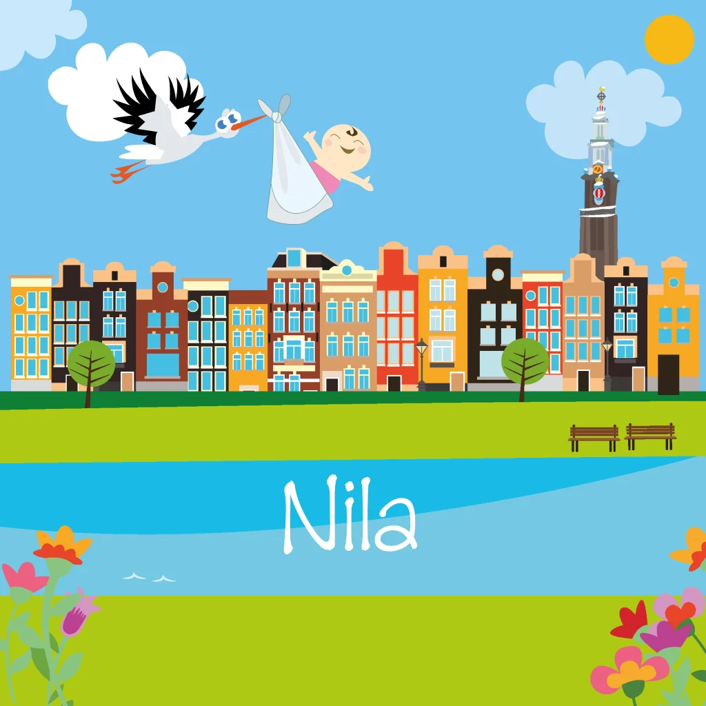 Leuk vrolijk geboortekaartje voor een meisje, met een ooievaar die over Amsterdam, met haar grachten en Westerkerk, heen vliegt. (10039)