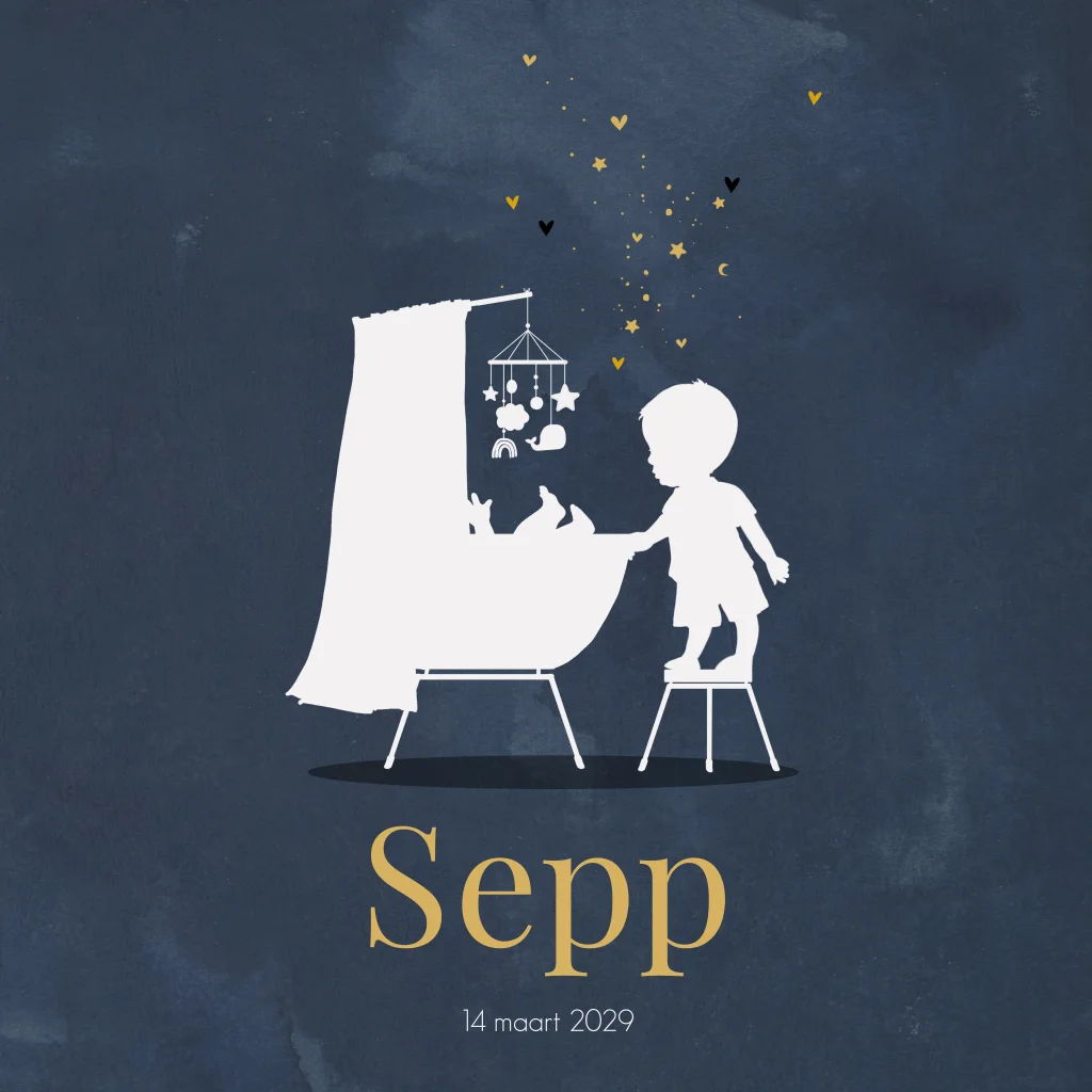 2e kindje geboortekaartje jongen Sepp blauw in wieg