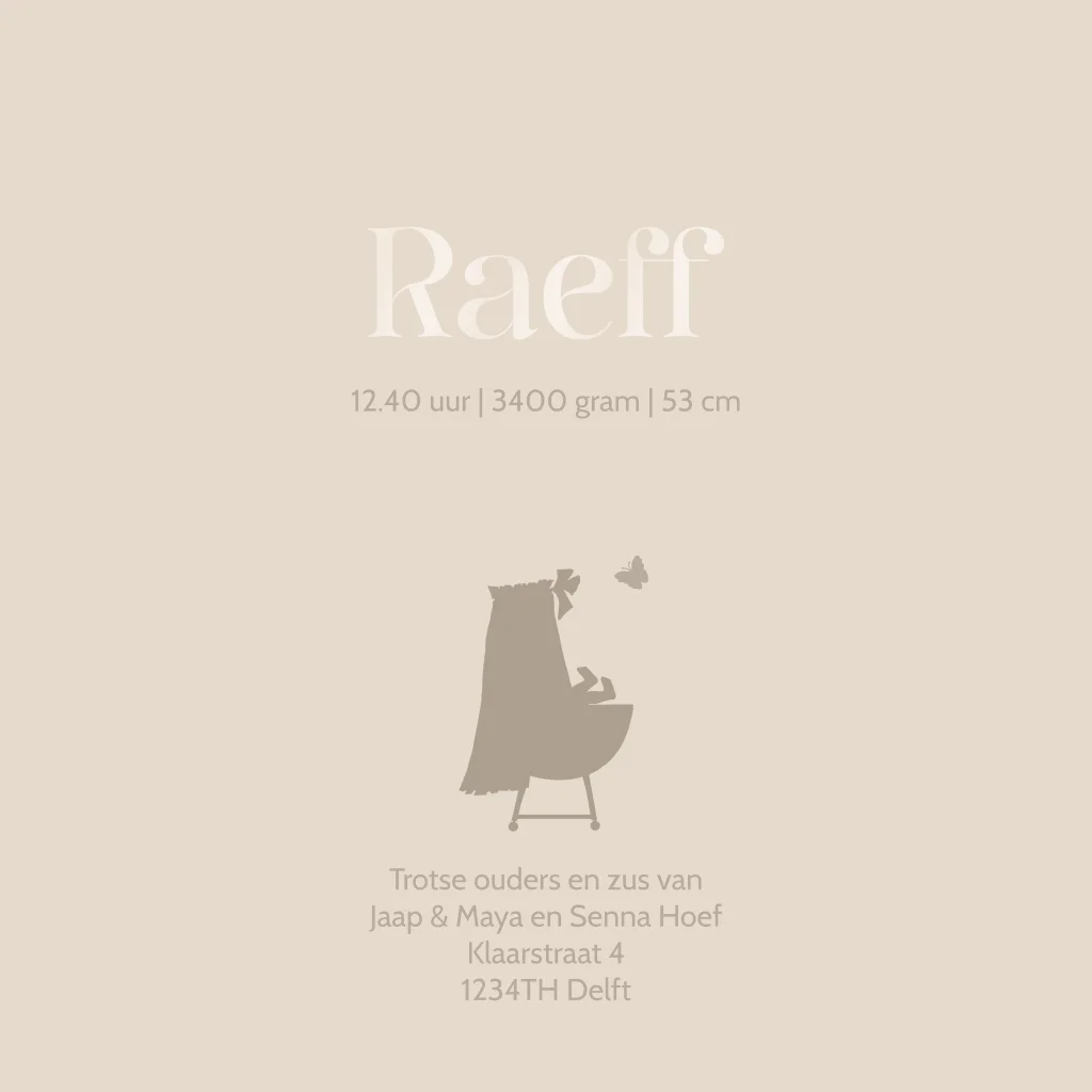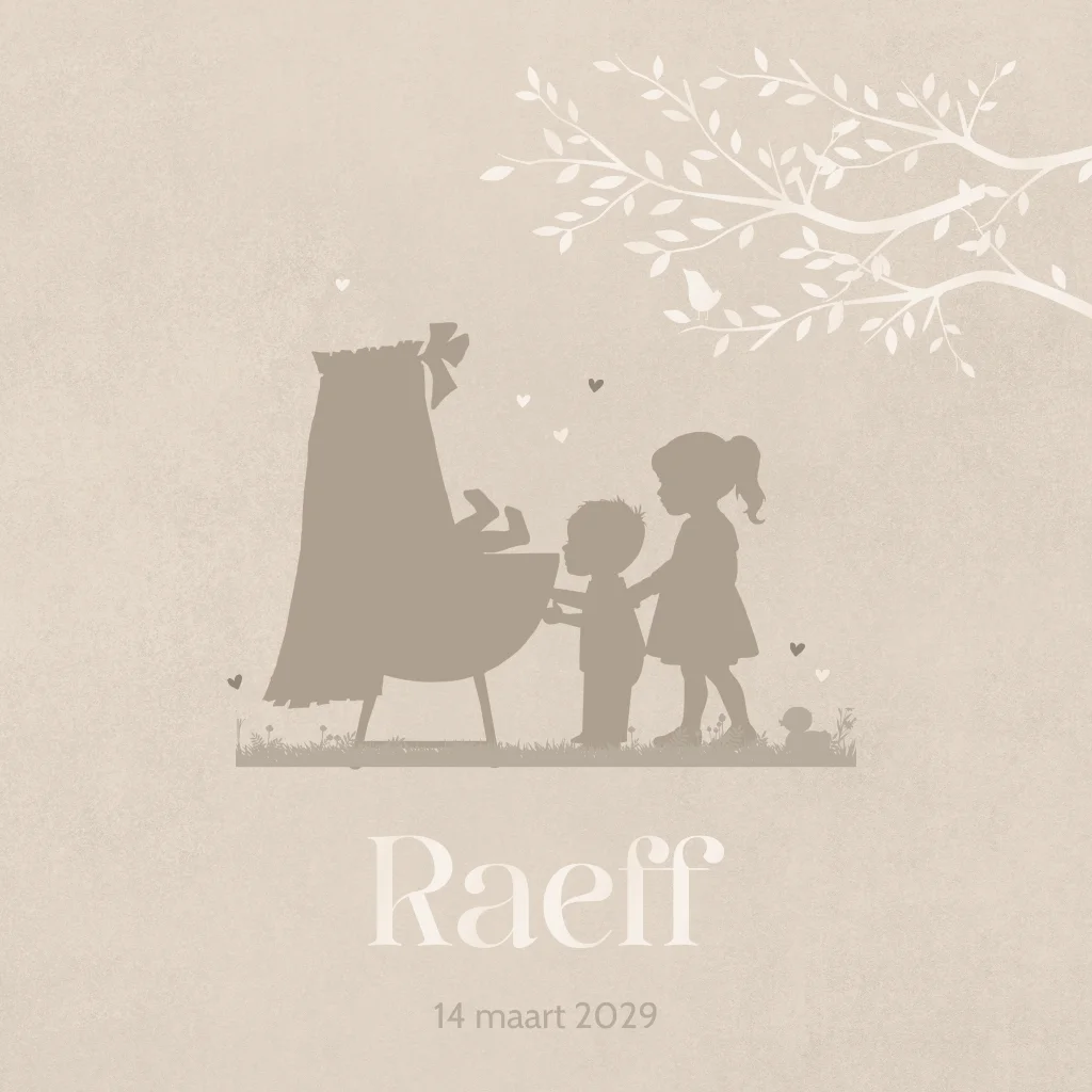 Natural Beige geboortekaartje jongens baby in wiegje voor een 3e kindje met broer en zus. Op de voorkant staan de naam en tak in mooie glimmende hoogglans druk (30367). Wil je een andere kleuren of andere samenstelling van broer(s)/zus(sen) op het kaartje? Dat kan. Als het niet lukt dit aan te passen, neem dan contact op.