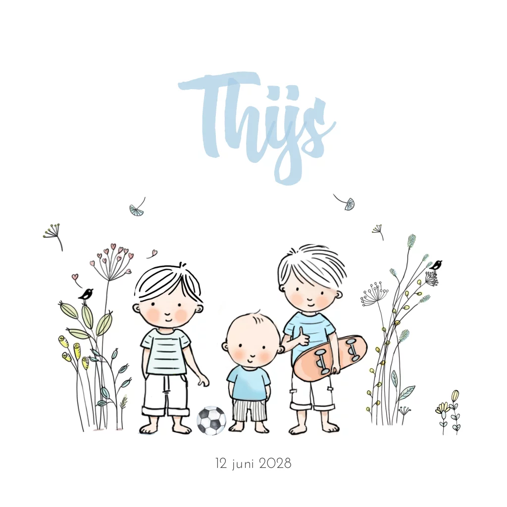 Geboortekaartje van drie jongens met voetbal en skateboard 3e kindje