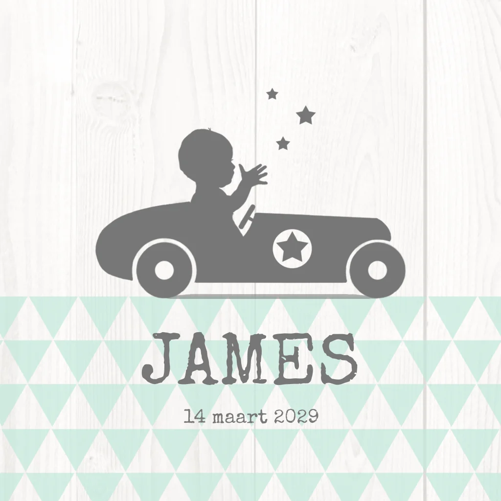 Geboortekaartje profiel jongens baby in een loop/raceauto met ster en hout, super stoer! (4856)