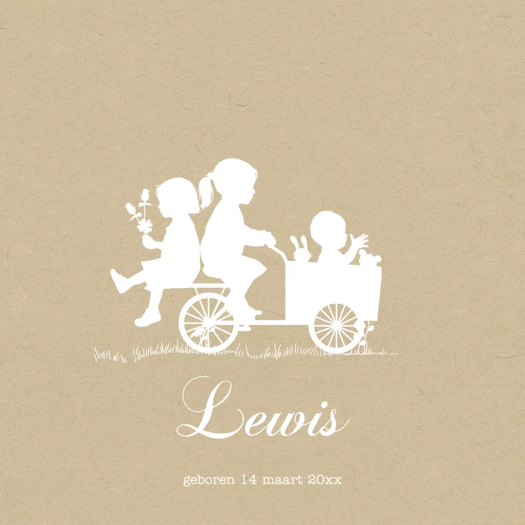 Bakfiets geboortekaartje met grote zussen en baby broertje derde kindje op karton-look achtergrond. (4422)