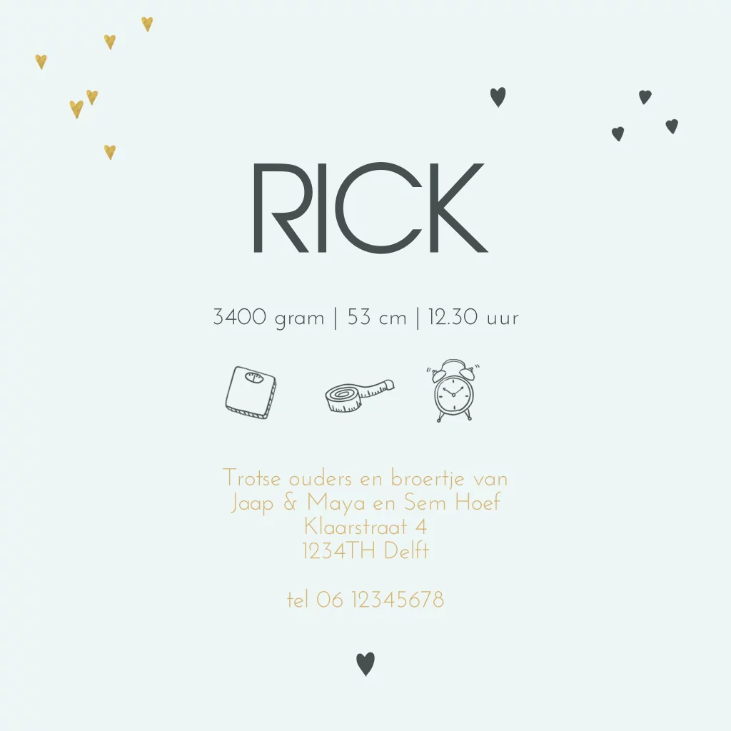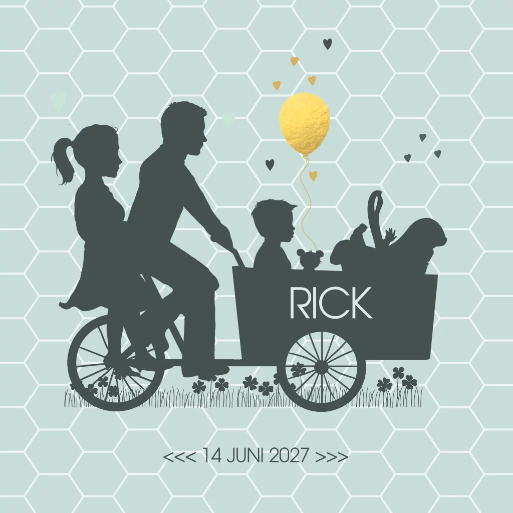 Geboortekaartje met ouders op een bakfiets en de baby in een maxi-cosi en grote broer in de bak. In mooie aanpasbare kleuren. Leuke goudkleurige accenten. (6757)