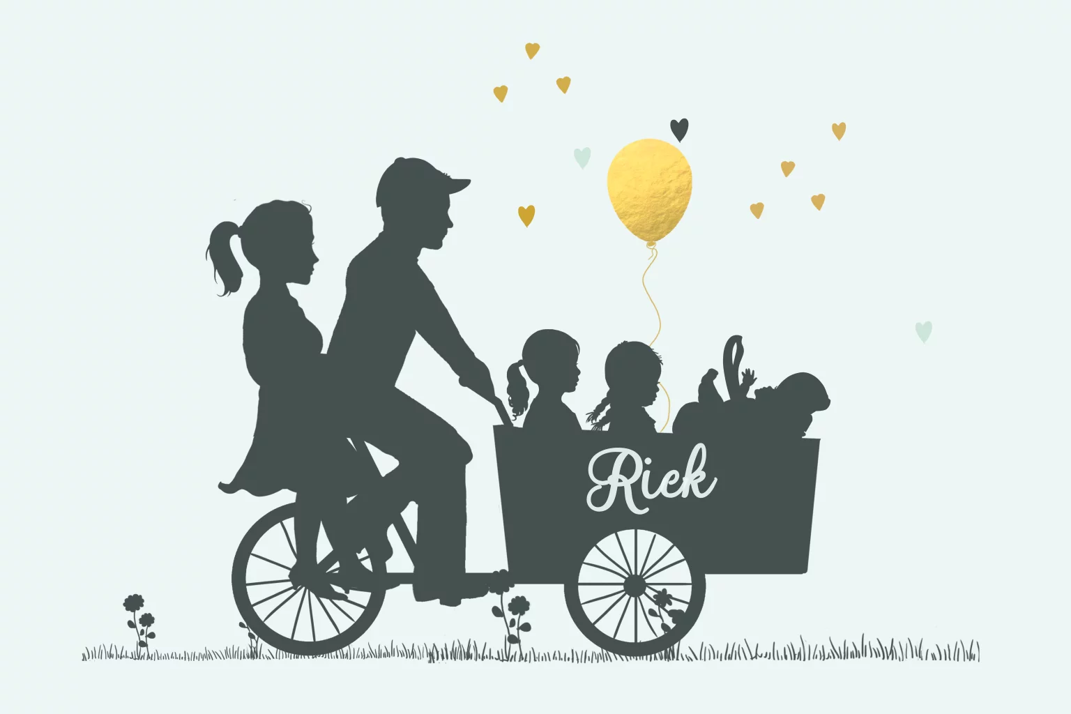 3e kindje geboortekaart ouders op bakfiets en twee zusjes