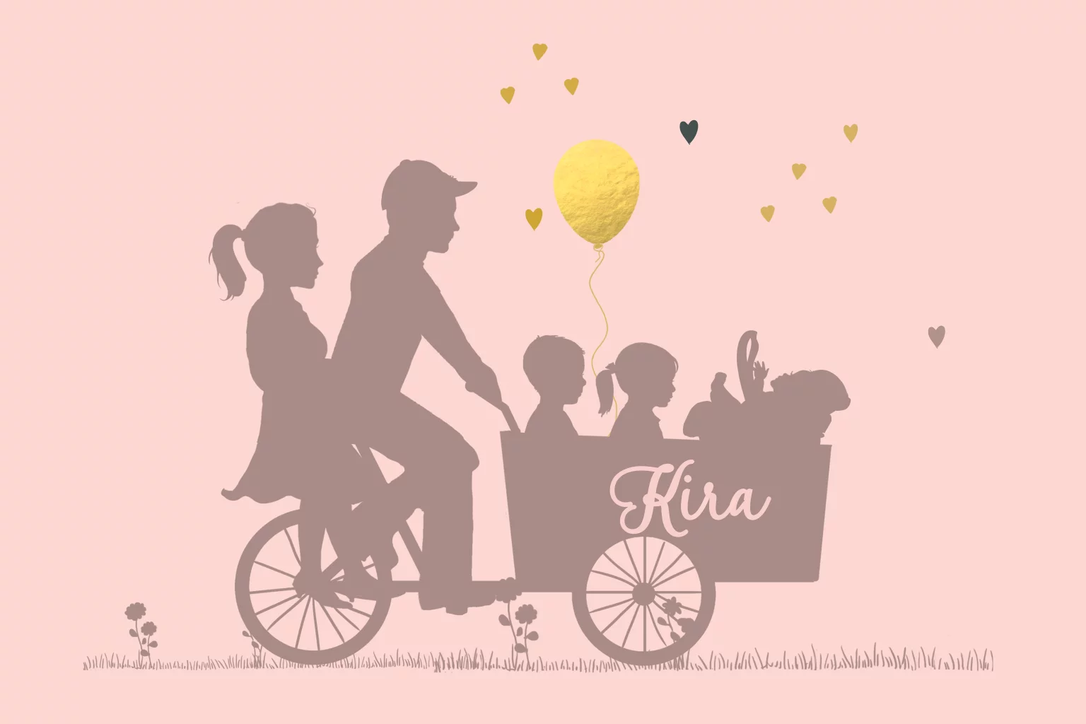 Profiel geboortekaartje 3e kindje met bakfiets en baby meisje in maxicosi in mooie aanpasbare kleuren. Leuke goudkleurige accenten. (6877)