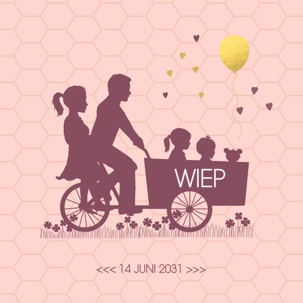 2e kindje geboortekaartje ouders met bakfiets en meisjes