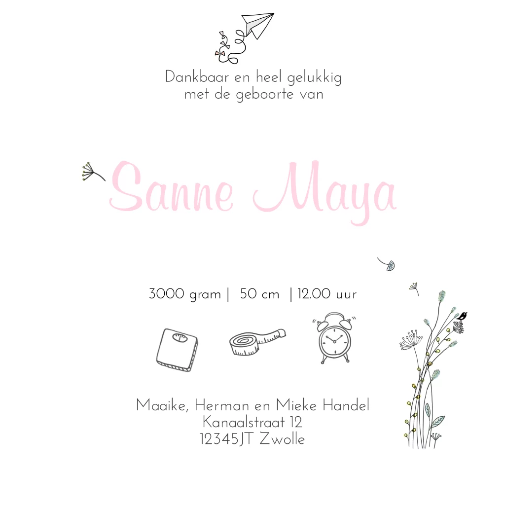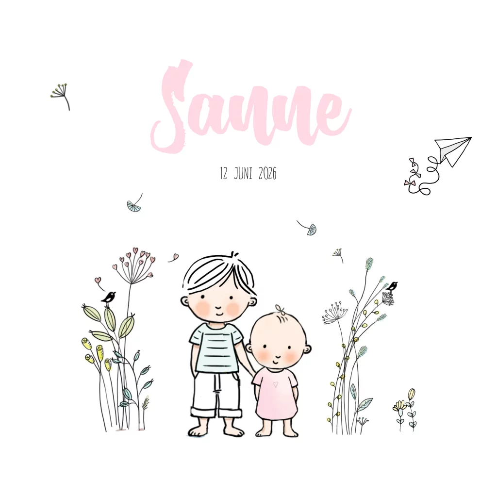 Geboortekaartje 2de kindje van een broertje en lief meisje met ballon met mooi getekende veldbloemen en vogeltje. Je kunt het ontwerp aanpassen naar de gewenste gezinssituatie. Een kindje/afbeelding kun je toevoegen voegen via onze clipart-bibliotheek. (7043)