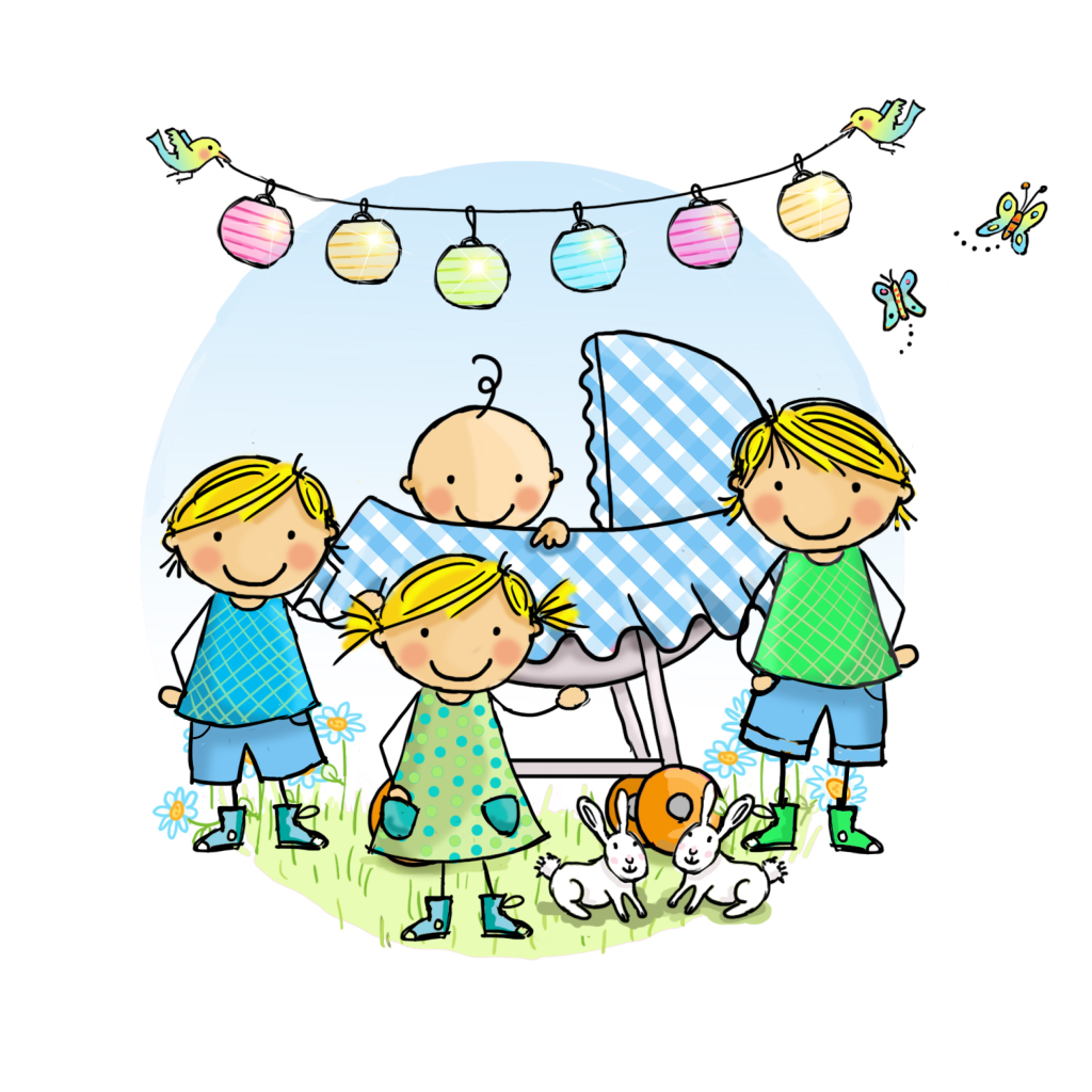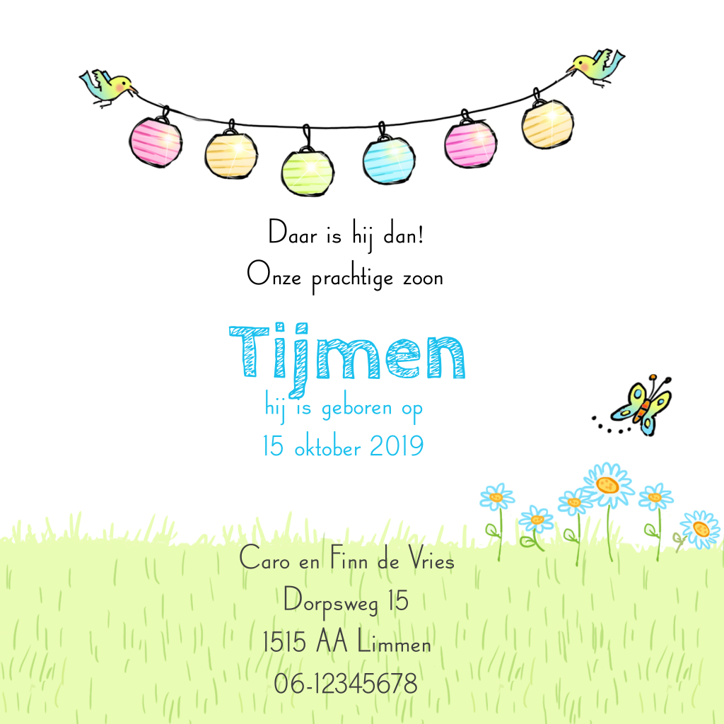 Geboortekaart jongen vierde kindje met broer en kinderwagen in blauw. Witte konijntjes in groen gras. (615)