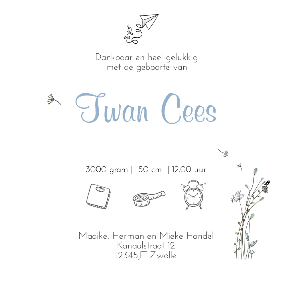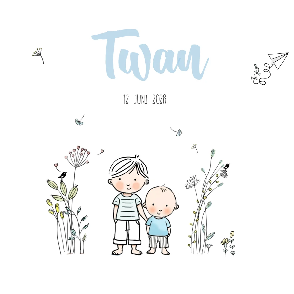 Geboortekaartje 2e kindje voor een jongen met getekende bloemen. Je kunt het ontwerp aanpassen naar de gewenste gezinssituatie. Een kindje/afbeelding kun je toevoegen voegen via onze clipart-bibliotheek. (7045)