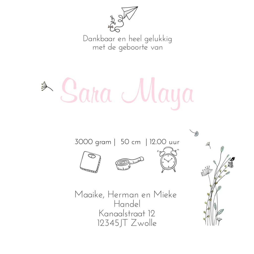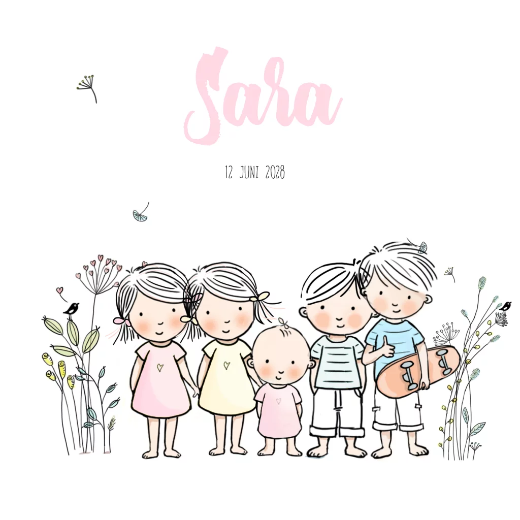 5e kindje Geboortekaartje van een stoere broers, zusjes en lief meisje met ballon met mooi getekende veldbloemen en vogeltje.Je kunt het ontwerp aanpassen naar de gewenste gezinssituatie. Een kindje/afbeelding kun je toevoegen voegen via onze clipart-bibliotheek. (7044)