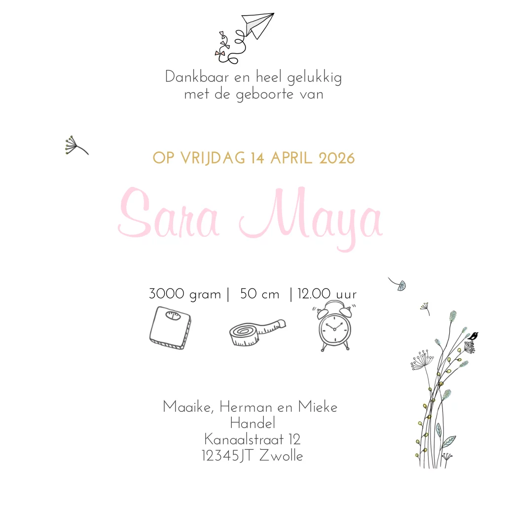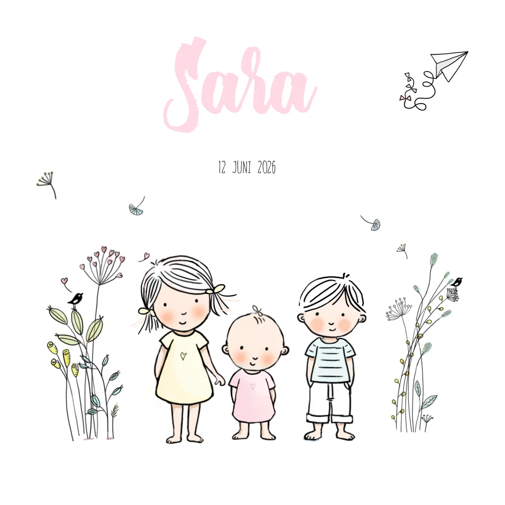 Geboortekaartje 3e kindje van een stoere broer, zusje en lief meisje met ballon met mooi getekende veldbloemen en vogeltje.Je kunt het ontwerp aanpassen naar de gewenste gezinssituatie. Een kindje/afbeelding kun je toevoegen voegen via onze clipart-bibliotheek. (7044)