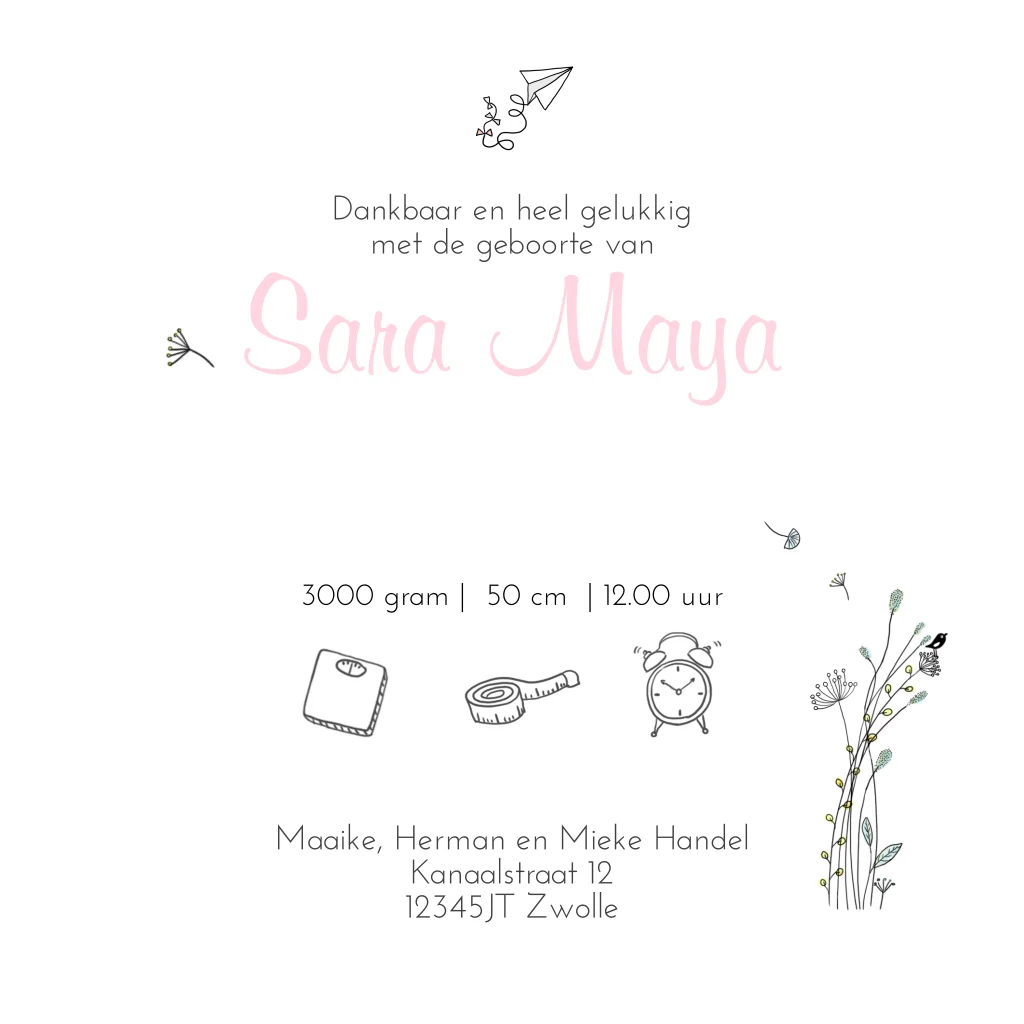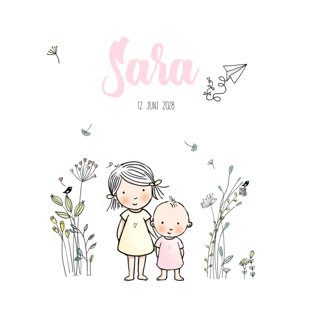 Geboortekaartje 2e kindje zusje en lief meisje met ballon met mooi getekende veldbloemen en vogeltje.Je kunt het ontwerp aanpassen naar de gewenste gezinssituatie. Een kindje/afbeelding kun je toevoegen voegen via onze clipart-bibliotheek. (7042)