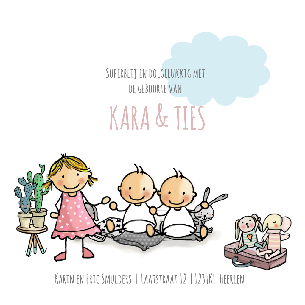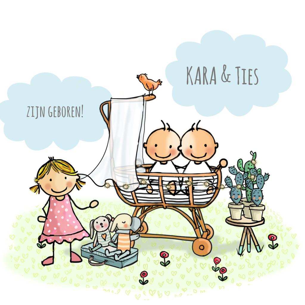 Lief pastel kleurig geboortekaartje tweeling met zus illustraties. Super lief en schattig. (3368)