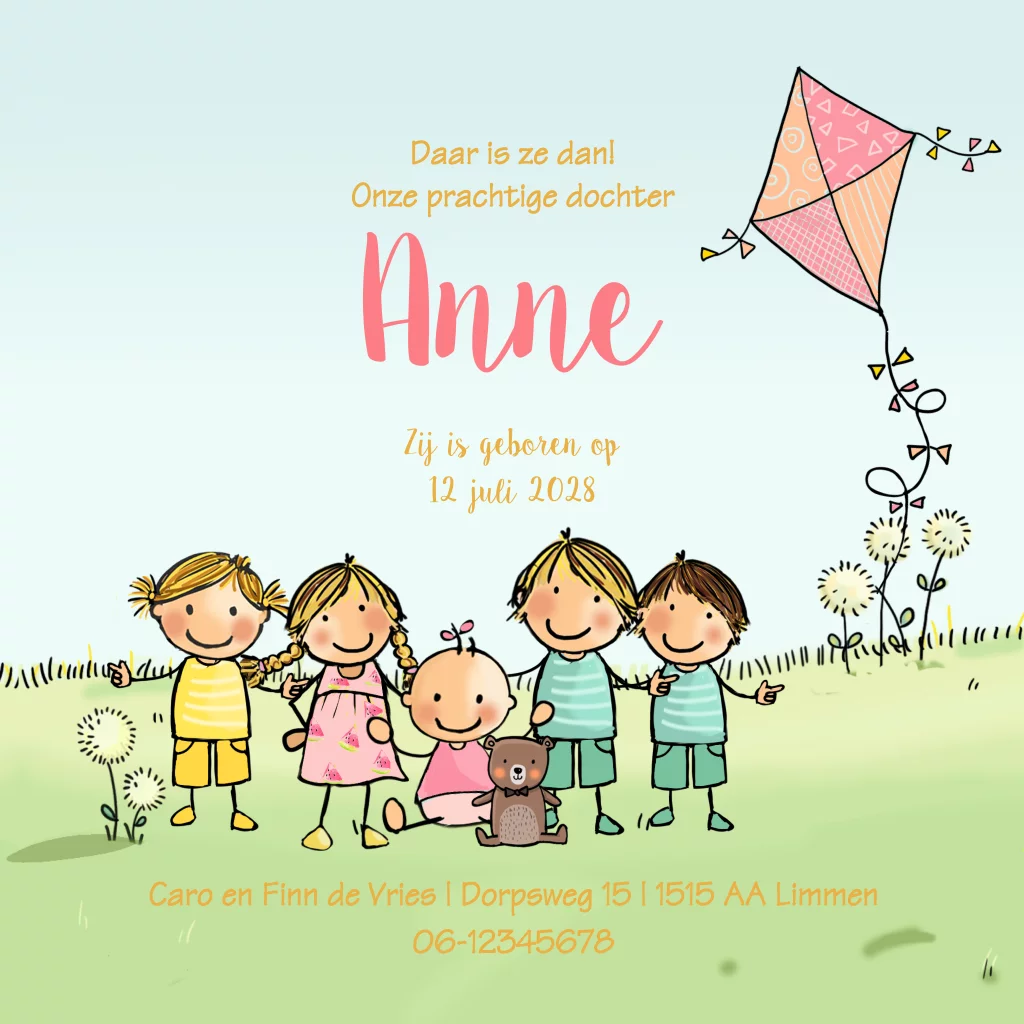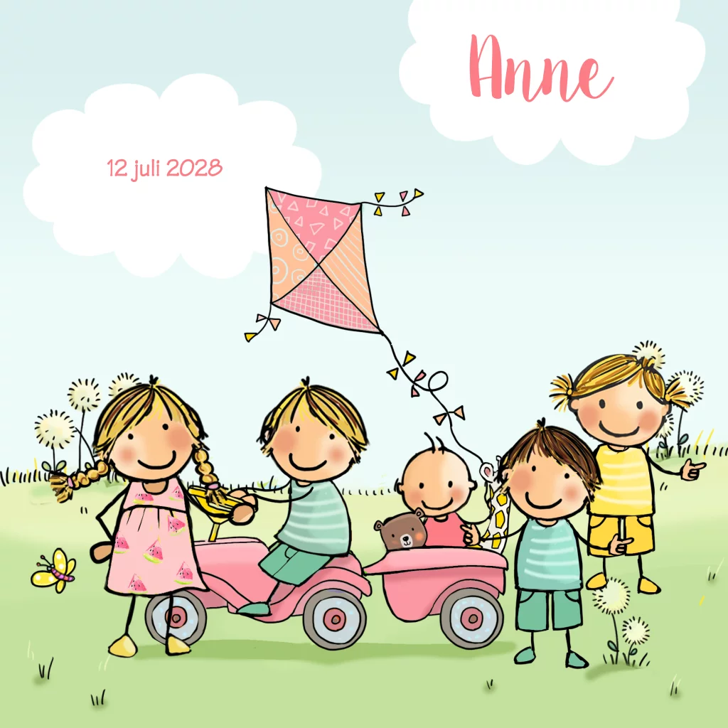 Geboortekaart 5e kindje voor een zusje met grote broers en zussen met baby meisje met auto en kar met beestjes. Een leuke vlieger met hippe achtergrond. Je kunt het ontwerp aanpassen naar de gewenste gezinssituatie. Een kindje/afbeelding kun je toevoegen voegen via onze clipart-bibliotheek. (7038)
