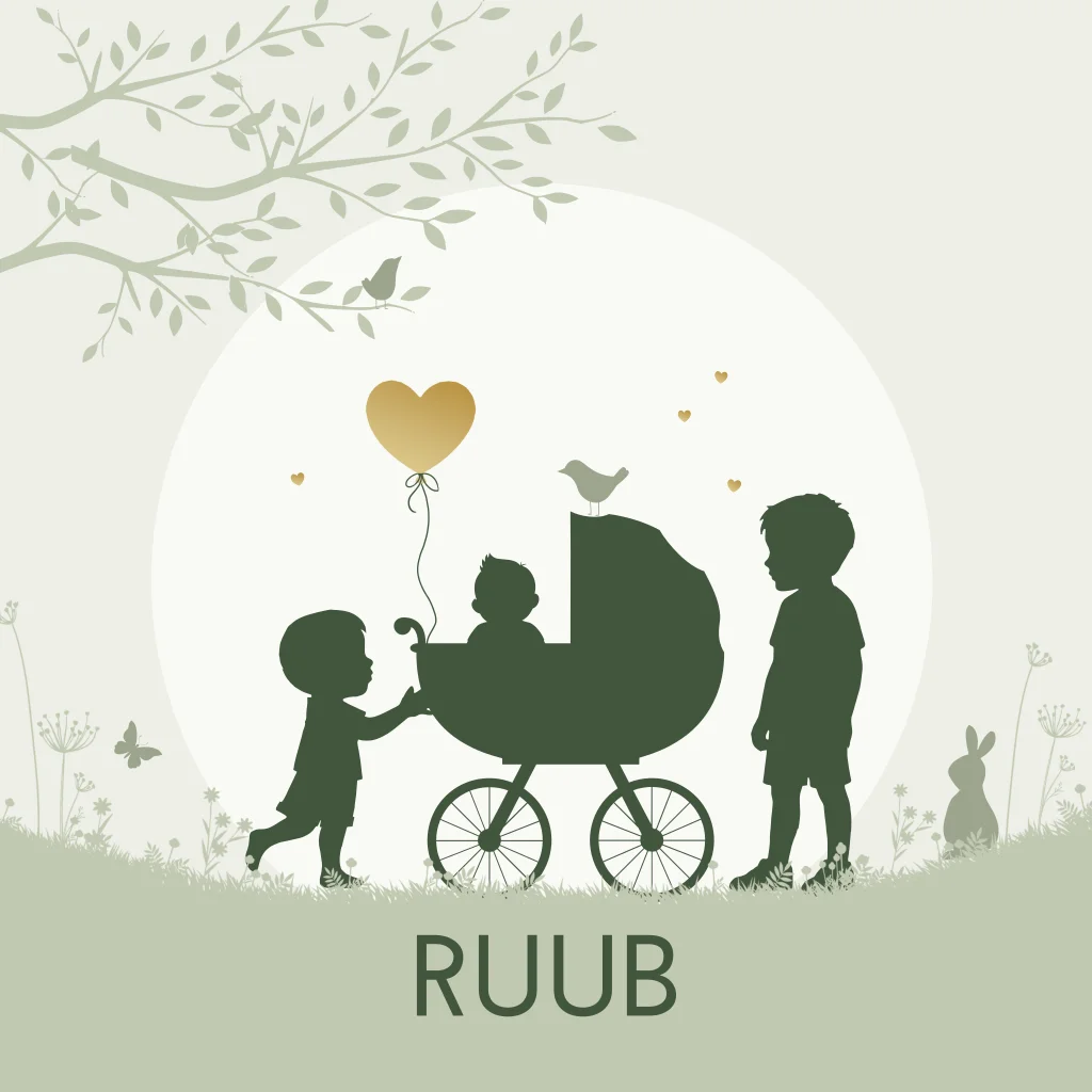 Geboortekaartje 3e kindje jongen in een kinderwagen met 2 grote broers naast de wagen. De baby ligt in een kinderwagen en de kaart is mooi versierd met dieren en natuur. De kleuren groen zijn naar wens aan te passen (30362) Wil je een andere kleuren of andere samenstelling van broer(s)/zus(sen) op het kaartje? Dat kan. Als het niet lukt dit aan te passen, neem dan contact op.