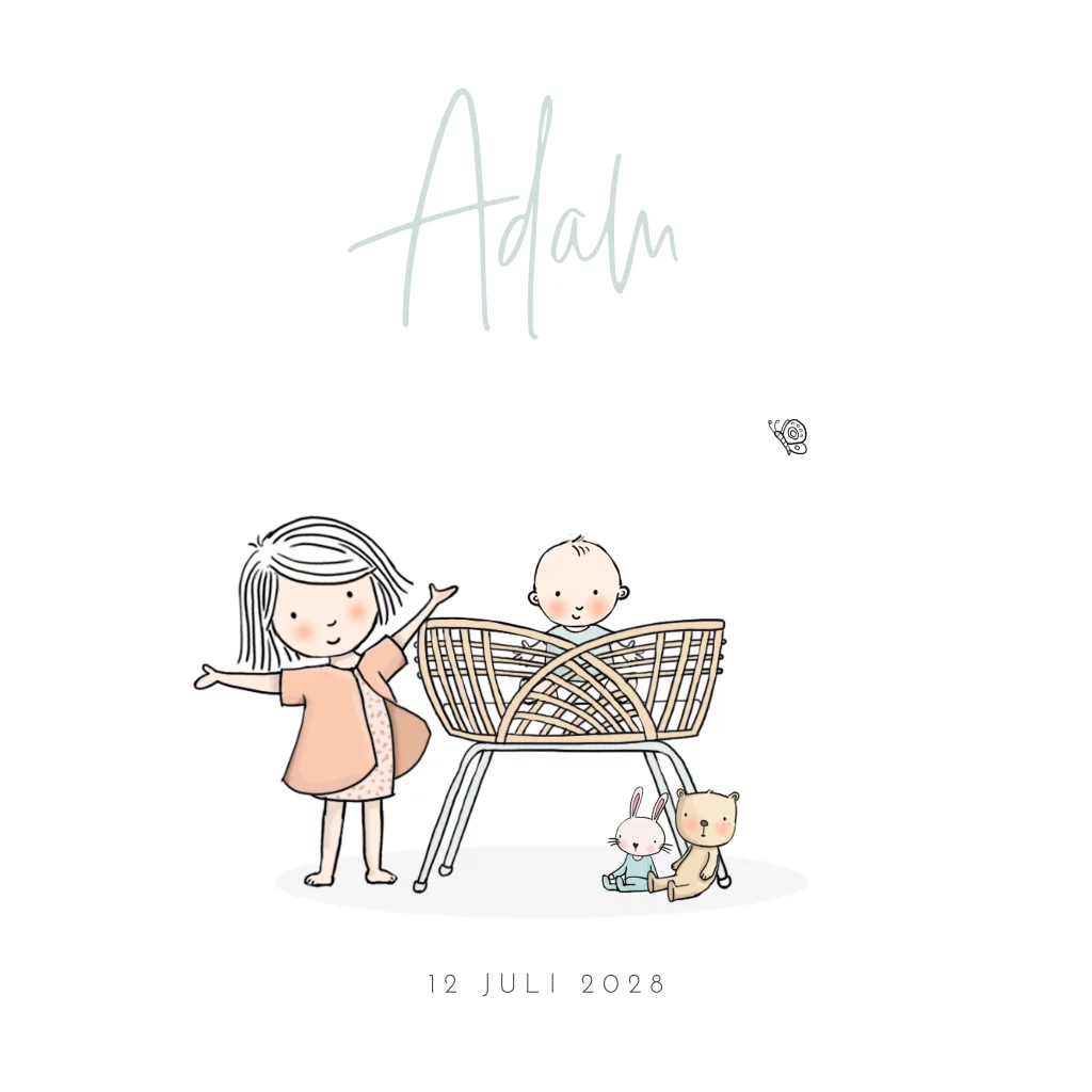 Geboortekaartje 2e kindje baby jongen en grote zus in rotan wiegje met takjes. (21110)