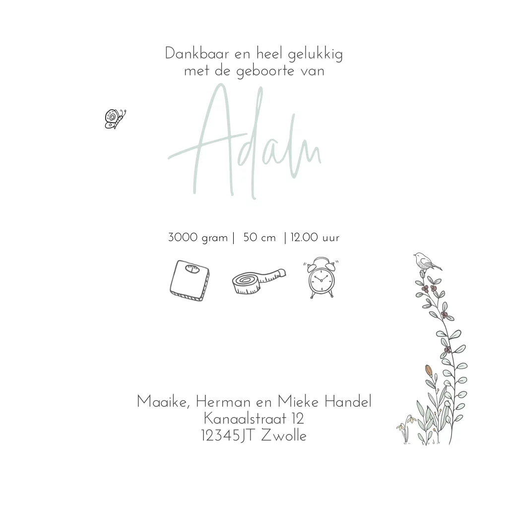 Geboortekaartje baby jongen en zusje in rotan wiegje met takjes