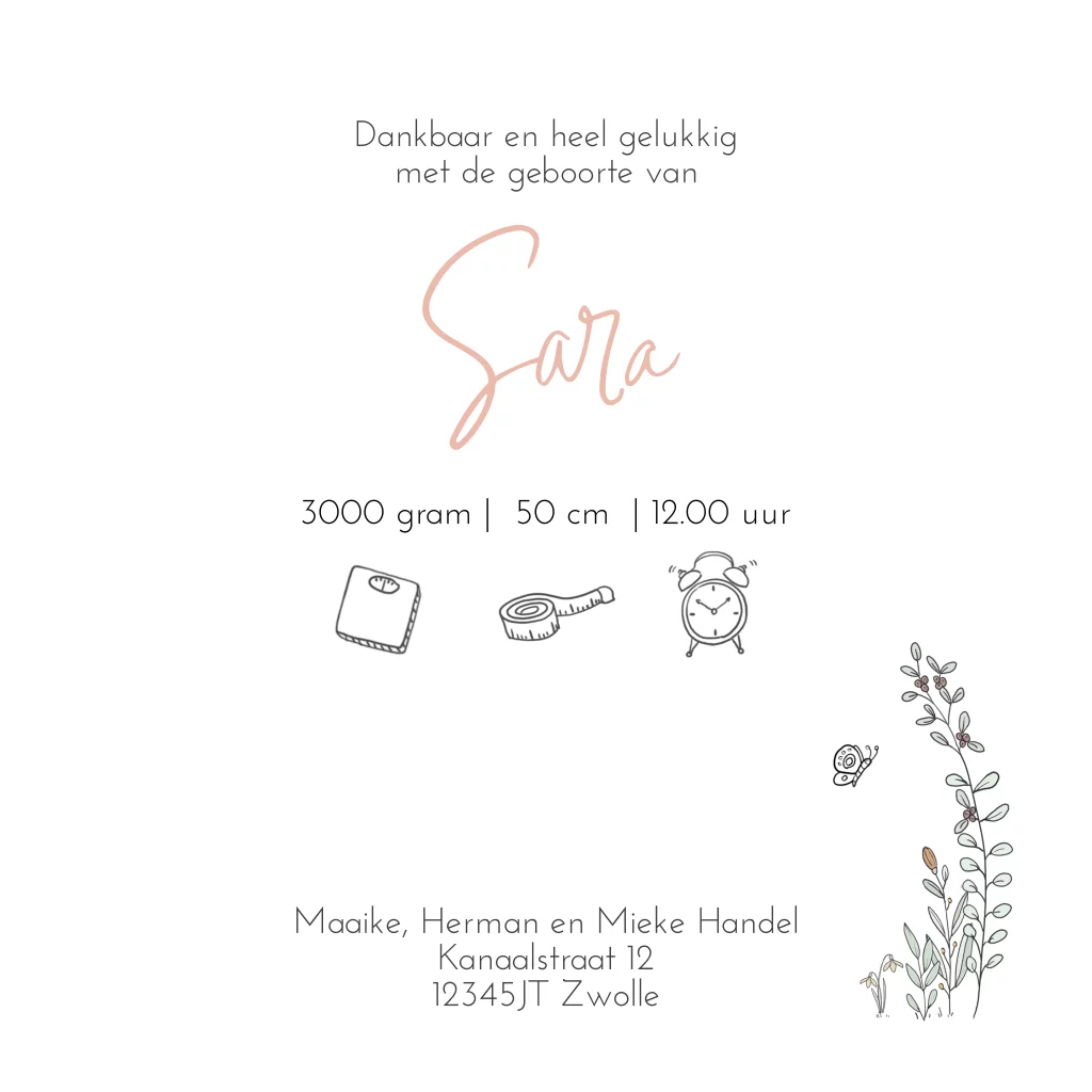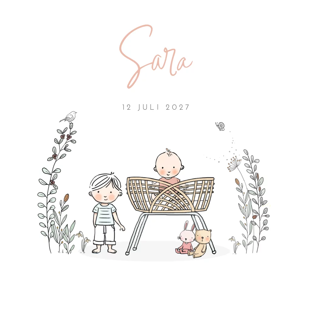 Geboortekaartje baby meisje en broer in rotan wiegje met takjes