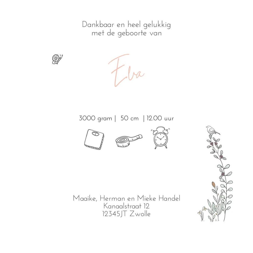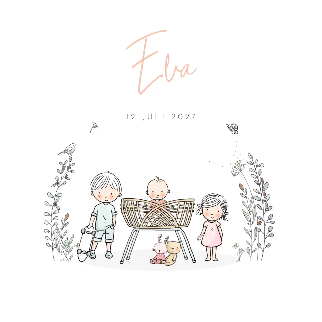 Geboortekaartje meisje en broer zusje in rotan wiegje met takjes