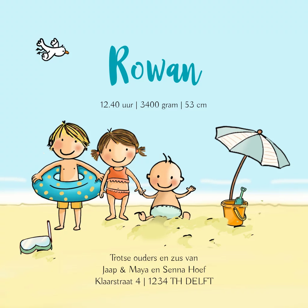 Geboortekaartje jongen 3e kindje strand met zusje en broer