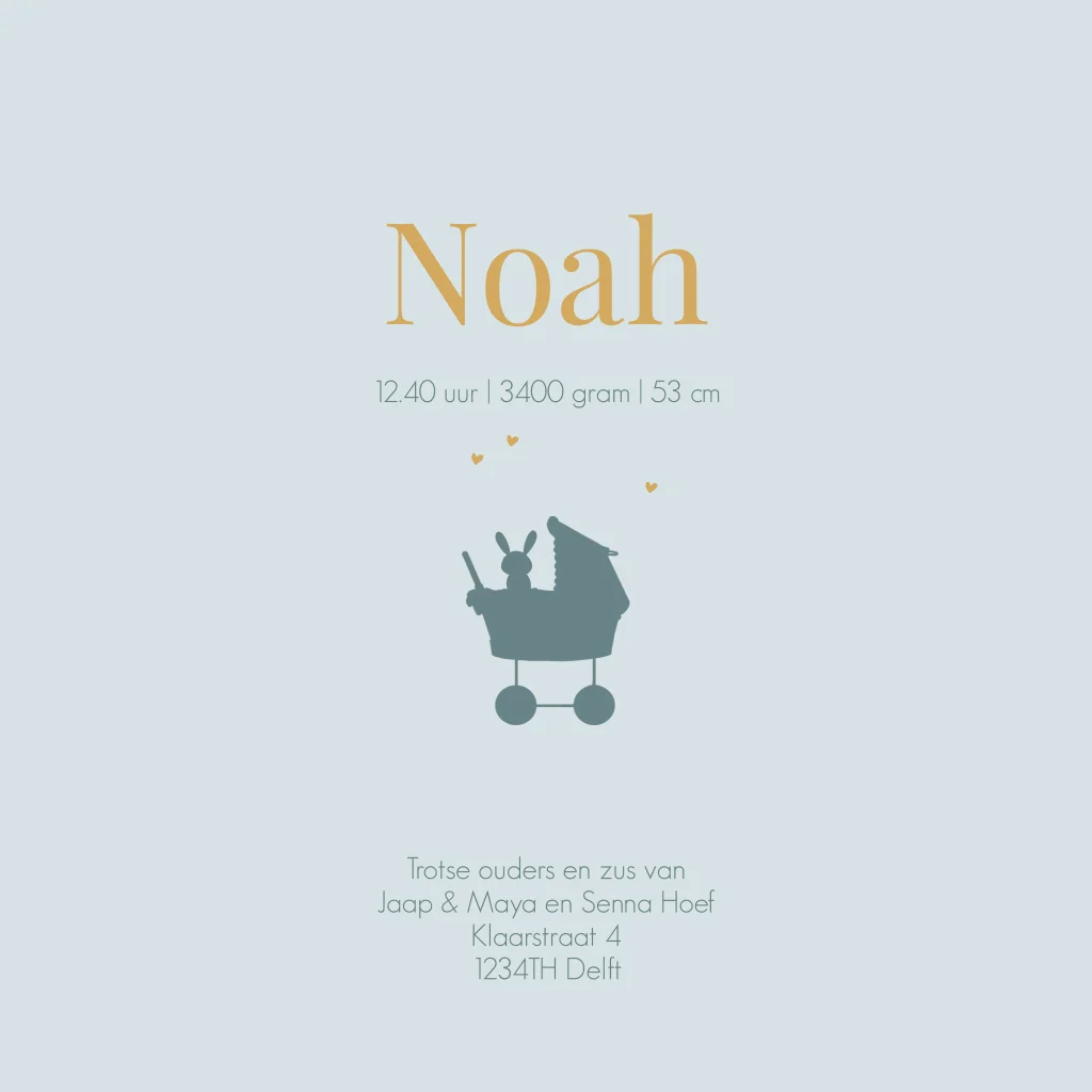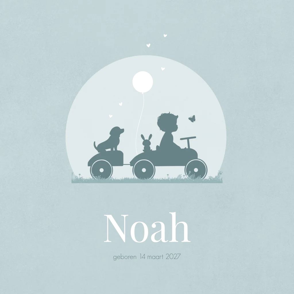 Geboortekaartje jongen in een loopauto met aanhanger met zijn huisdier hondje in de kar. De naam Noah staat in goudfolie. De hond is te vervangen door een ander huisdier en de kleuren zijn naar wens aan te passen (30366)