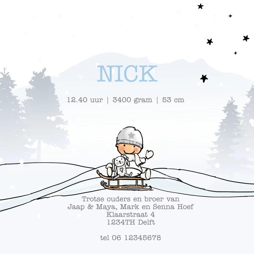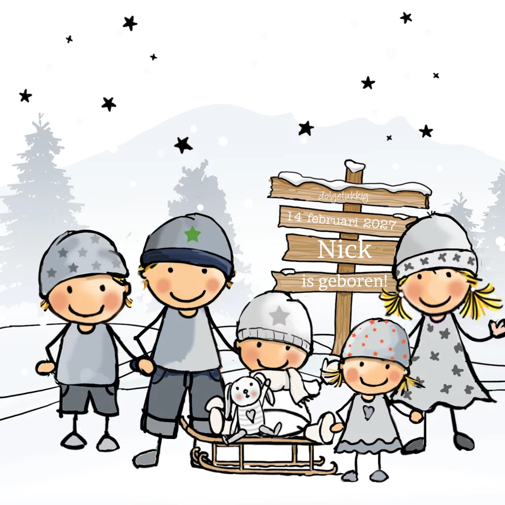 Geboortekaartje 5e kindje jongen in winterlandschap, getekend door Anet. Met sneeuw en houten bord met tekst. (2438)