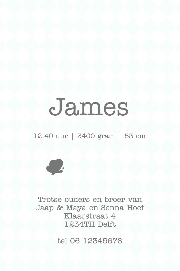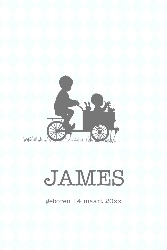 Bakfiets geboortekaartje voor een tweede kindje met ruitenpatroon. Ook in andere samenstellingen en kleuren leverbaar. (3617)