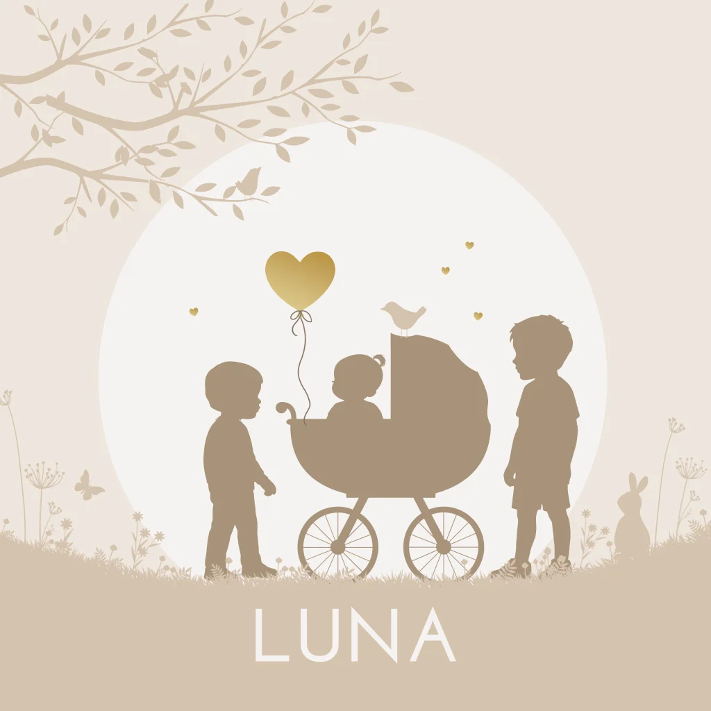 3e kindje geboortekaartje meisje in kinderwagen met silhouetten tekeningen van 2 grote broers naast de kinderwagen. Dit in een natuurlijke setting met gras, bloemen en dieren. (30363).Wil je een andere kleuren of andere samenstelling van broer(s)/zus(sen) op het kaartje? Dat kan. Als het niet lukt dit aan te passen, neem dan contact op.
