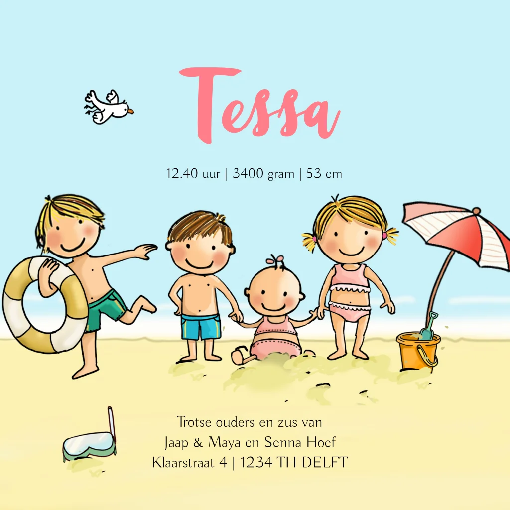 Geboortekaartje meisje 4e kindje strand met broertjes en zus. (9866) Wil je een andere kleuren of andere samenstelling van broer(s)/zus(sen) op het kaartje? Dat kan. Als het niet lukt dit aan te passen, neem dan contact op.