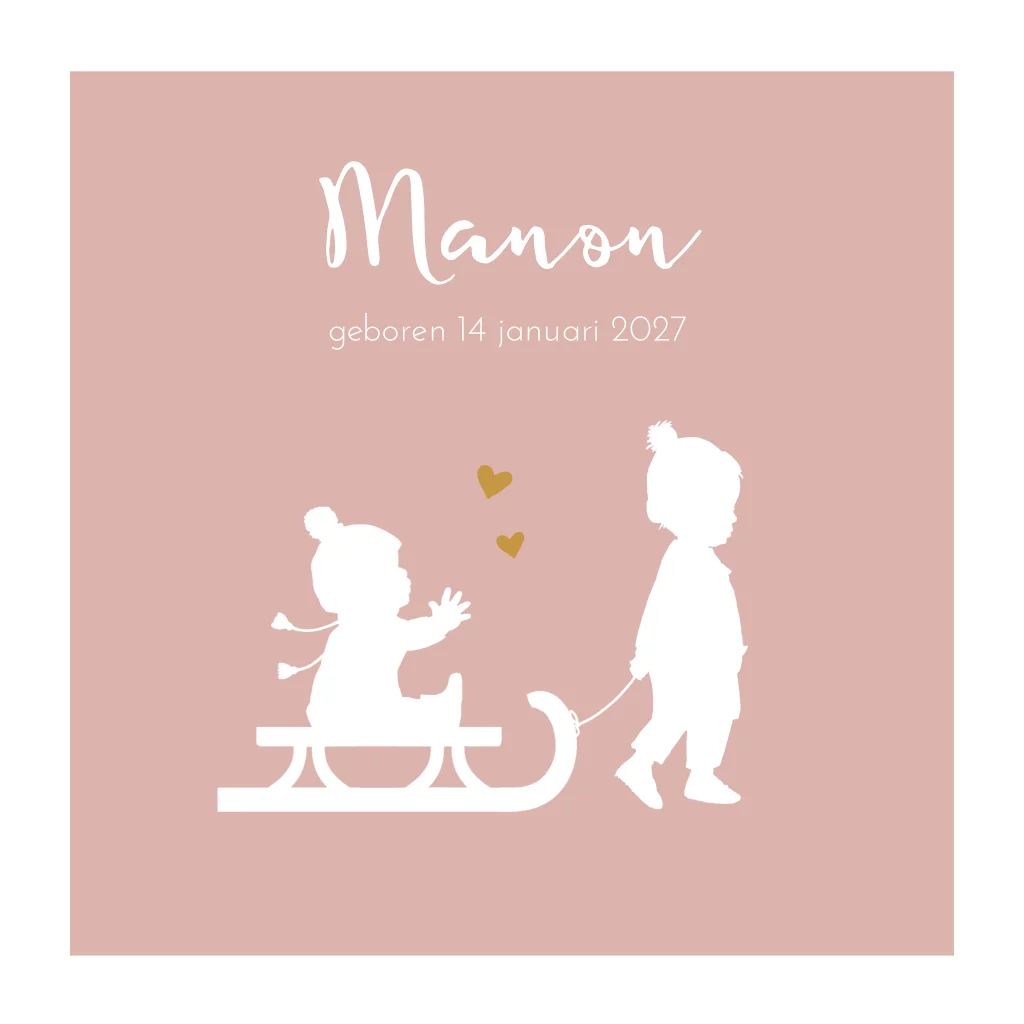Geboortekaartje meisje 2de kindje op een slee met haar grote broer. De kindjes zijn eenvoudig naar wens aan te passen in onze kaartenmaker. Onder "afbeeldingen en versieringen" vind je de verschillende kindjes. (7564)