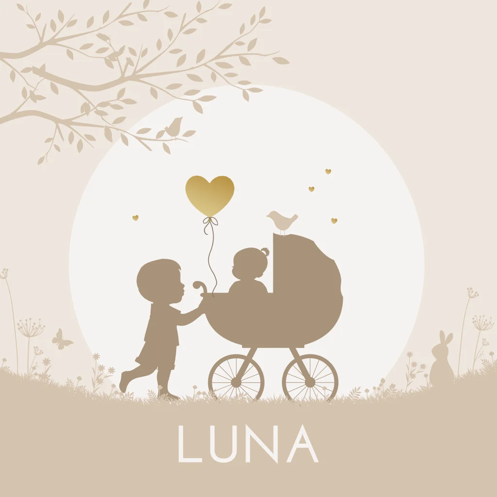 Tweede kindje geboortekaartje voor een baby meisje in kinderwagen met silhouet tekening broer achter de wagen. Dit in een natuurlijke setting met gras, bloemen en dieren als konijn en vogel. (30363) geboortekaartje Luna