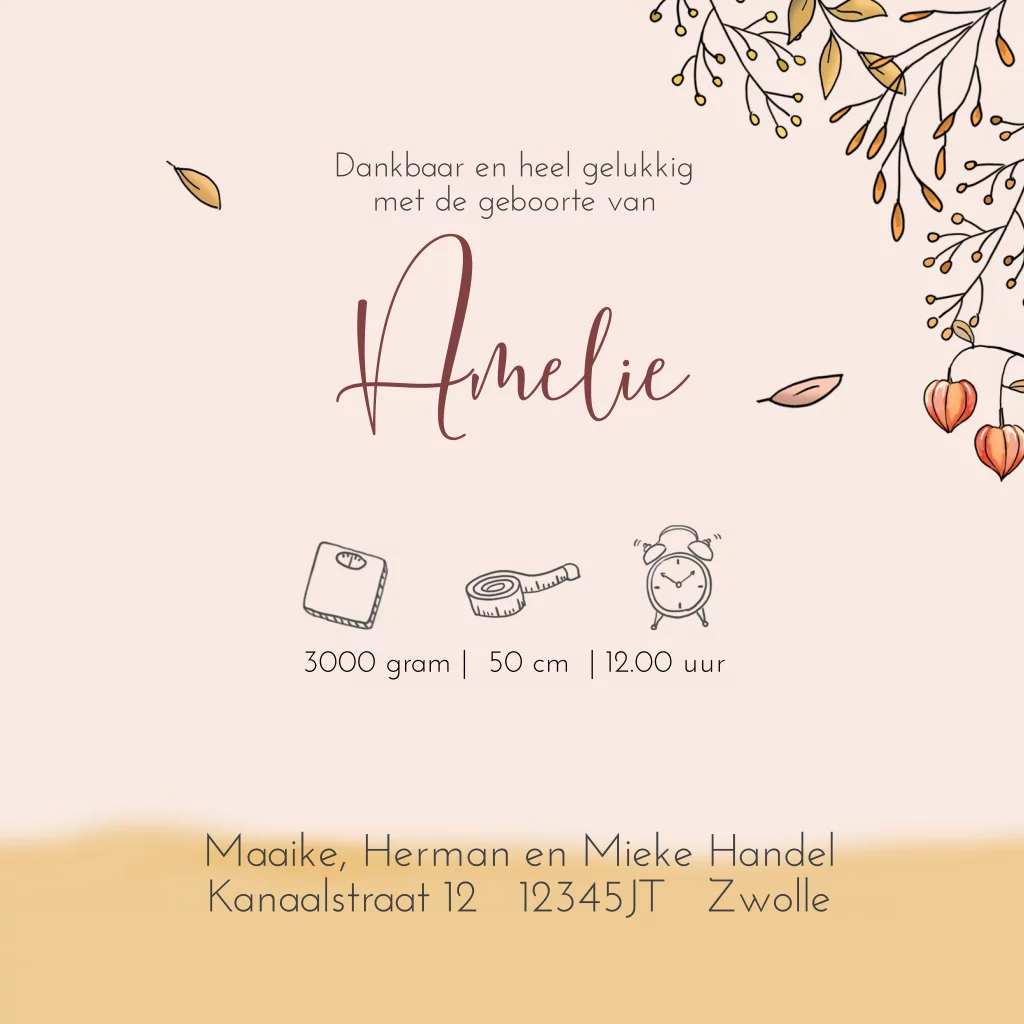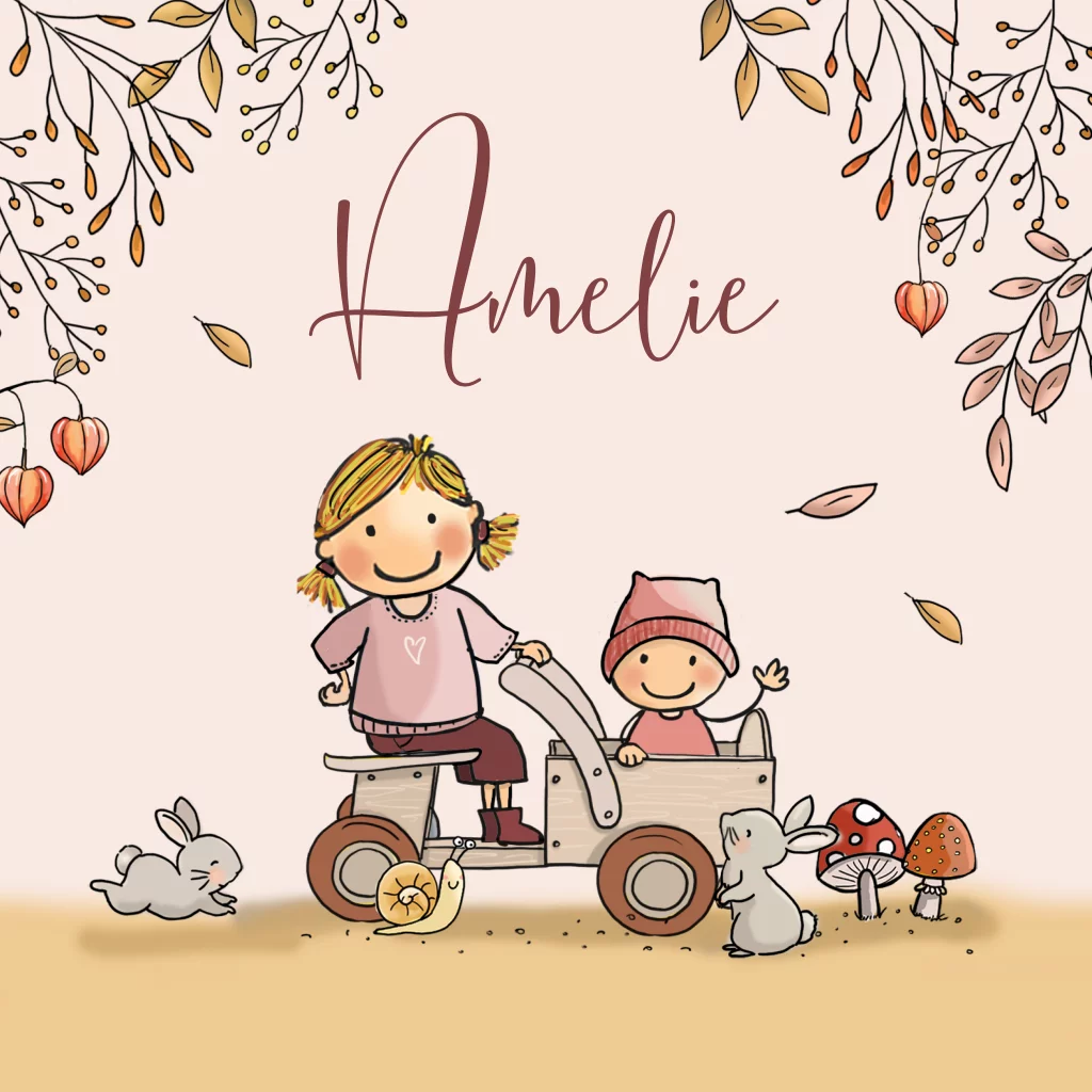 Geboortekaartje 2de kindje voor een zusje met houten kar herfst