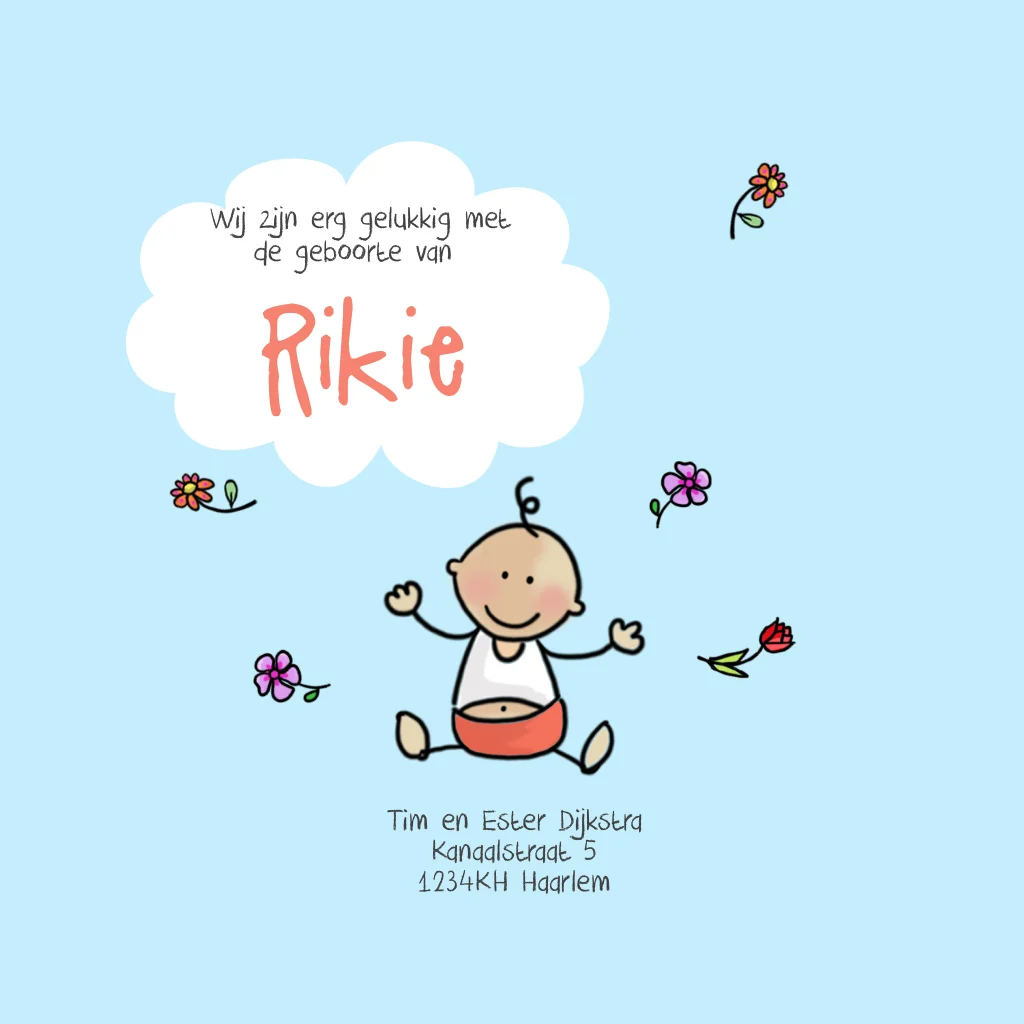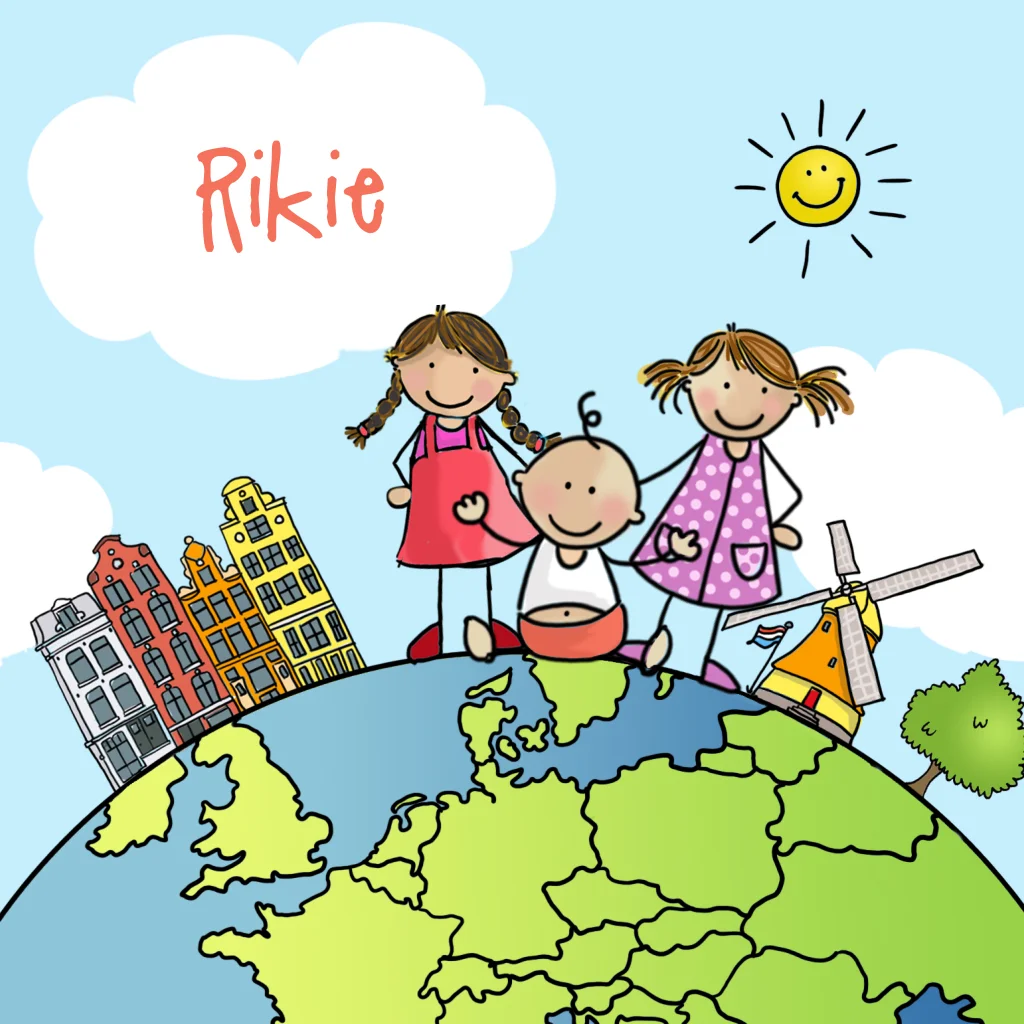Geboortekaartje meisje 3e kindje op wereldbol zusje ,daarbij huisjes, molen en diverse bloemen. Met contouren van Europa. (4273)