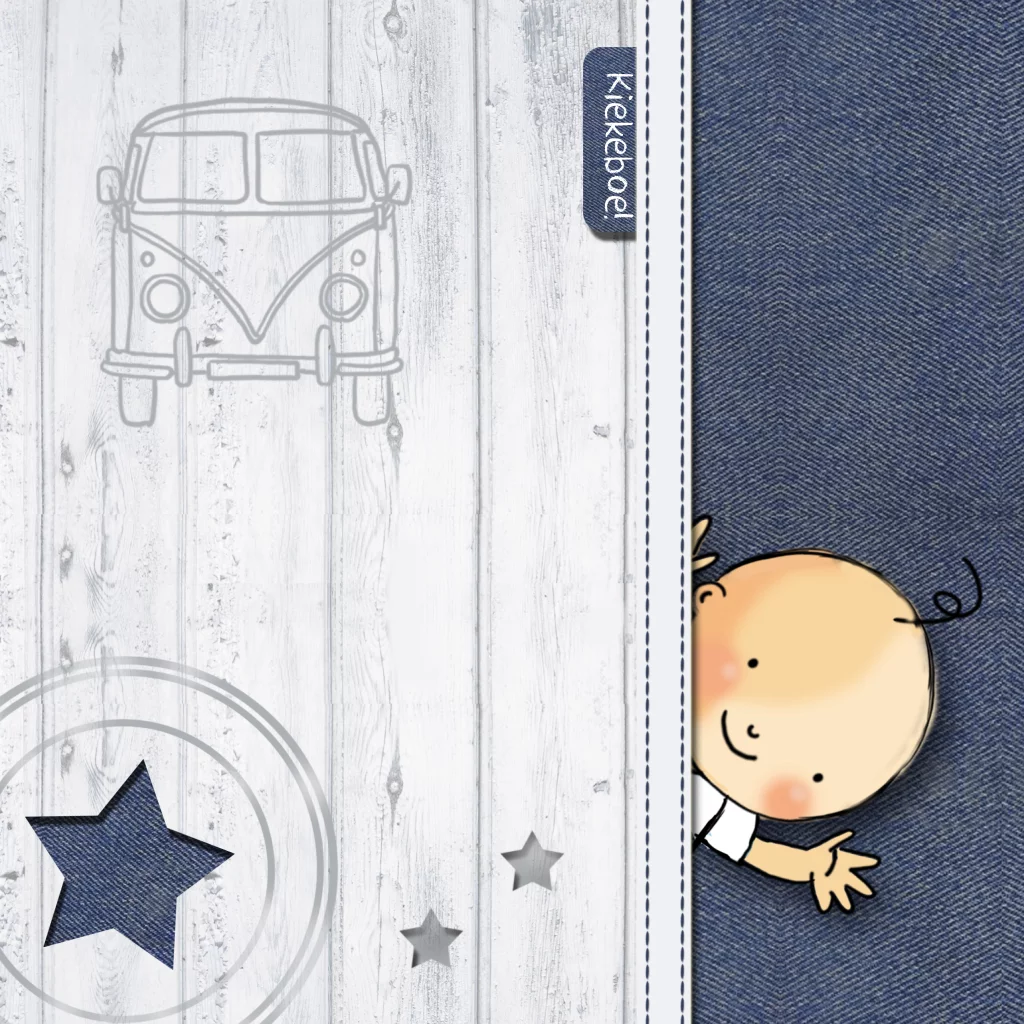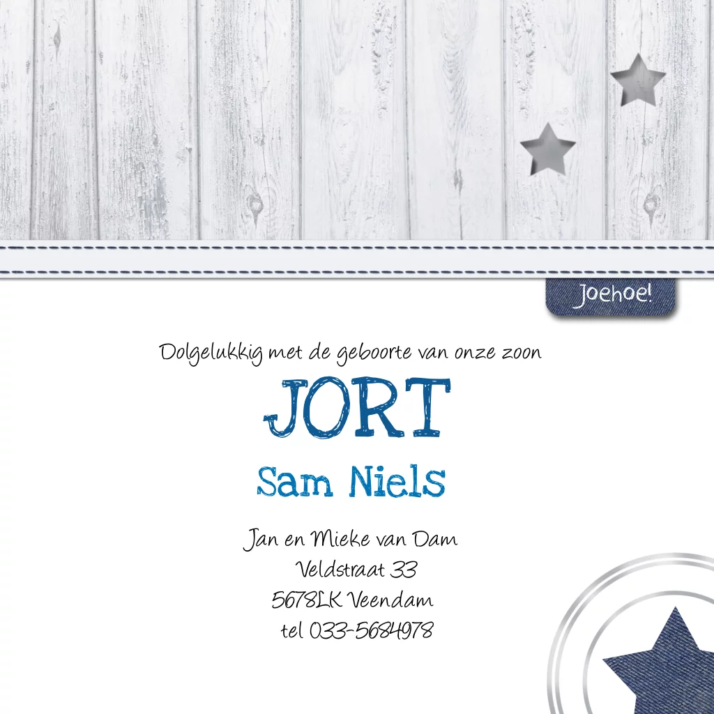 Geboortekaartje zoontje met blauwe spijker stof en steigerhout