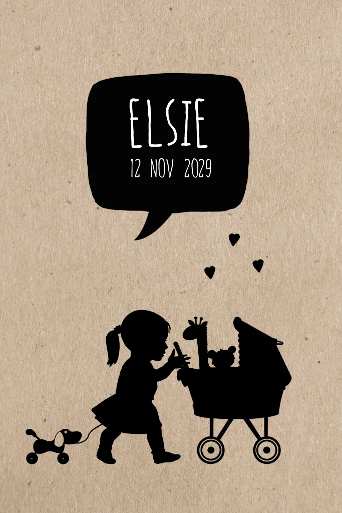 Kraft look geboortekaartje 2e kindje voor een jongen of meisje met een zusje die achter de kinderwagen loopt.
