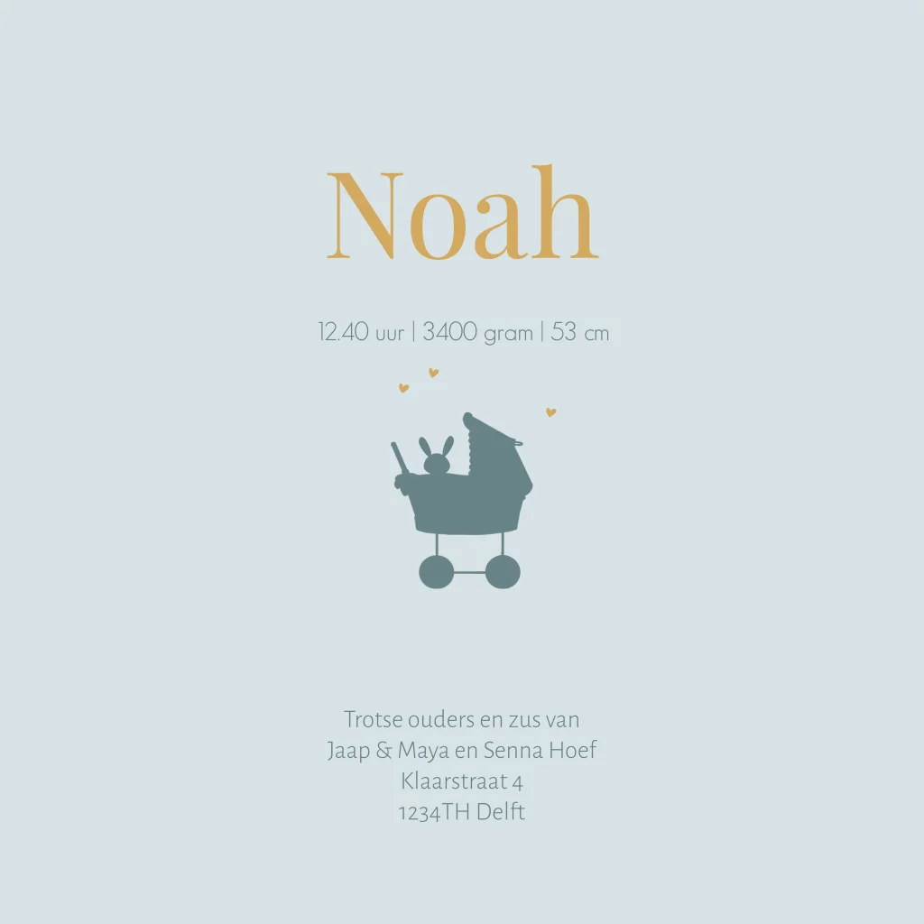 Geboortekaartje jongen met grote broer op een loopauto met aanhanger met zijn huisdier hondje in de kar. De naam Noah staat in goudfolie. (30366)
