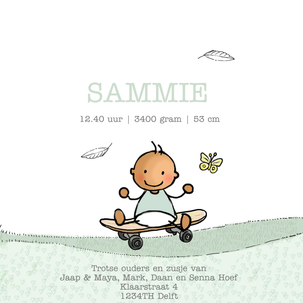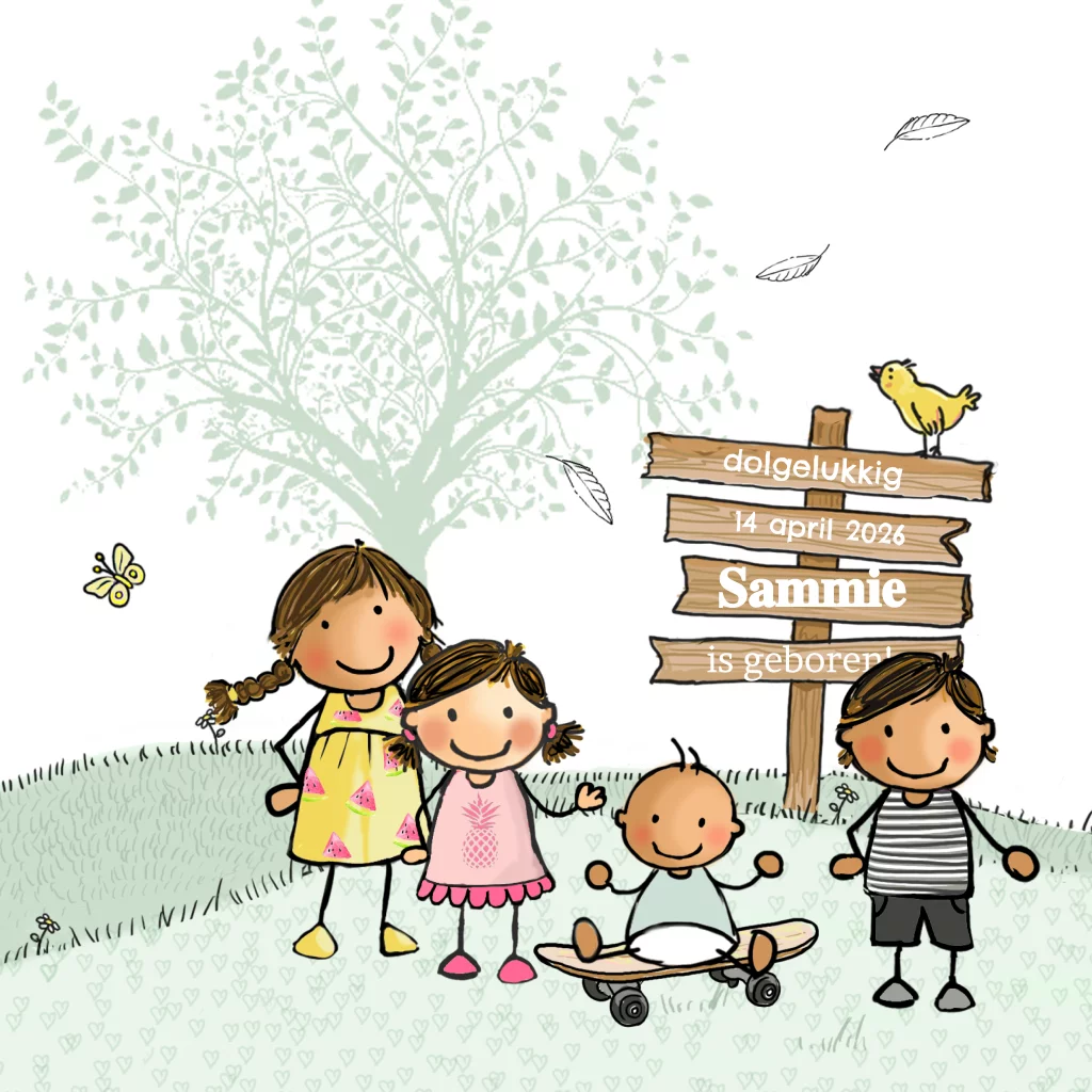 Getekend geboortekaartje jongen 4e kindje in lentelandschap vierde kindje. Met houten weg wijzerbord. (4962)