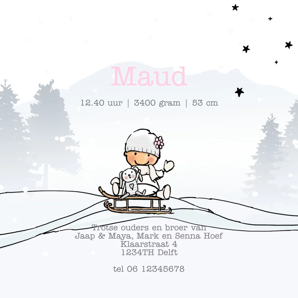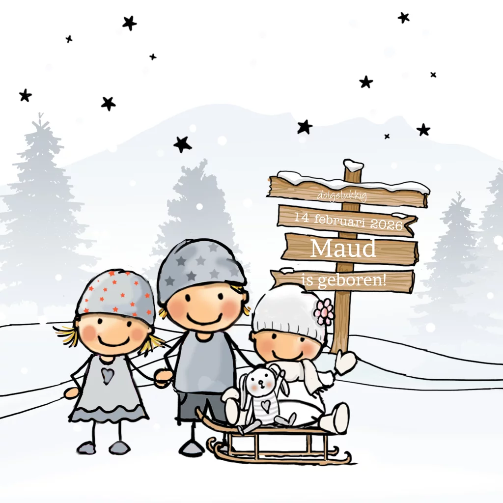 Getekend 3e kindje geboortekaartje meisje in de winter op een slee voor een derde kindje, getekend door Anet. Met houten weg wijzerbord. (2434)