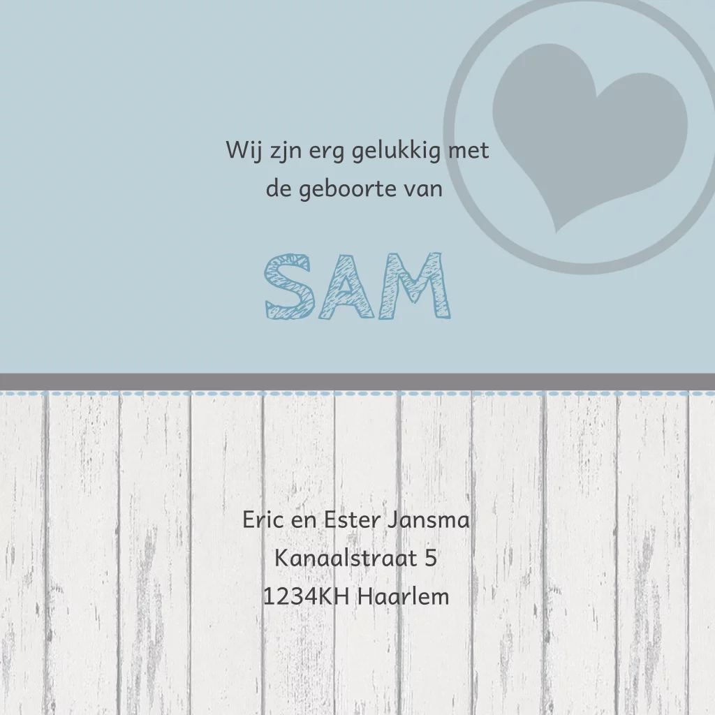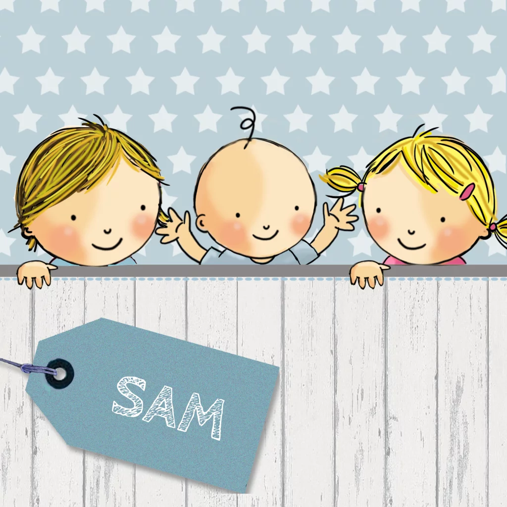 Getekende geboortekaart voor een derde kindje zoon. Geboortekaartje jongen met broer en zus. Met sterren in blauw en stempel hart. (1658)