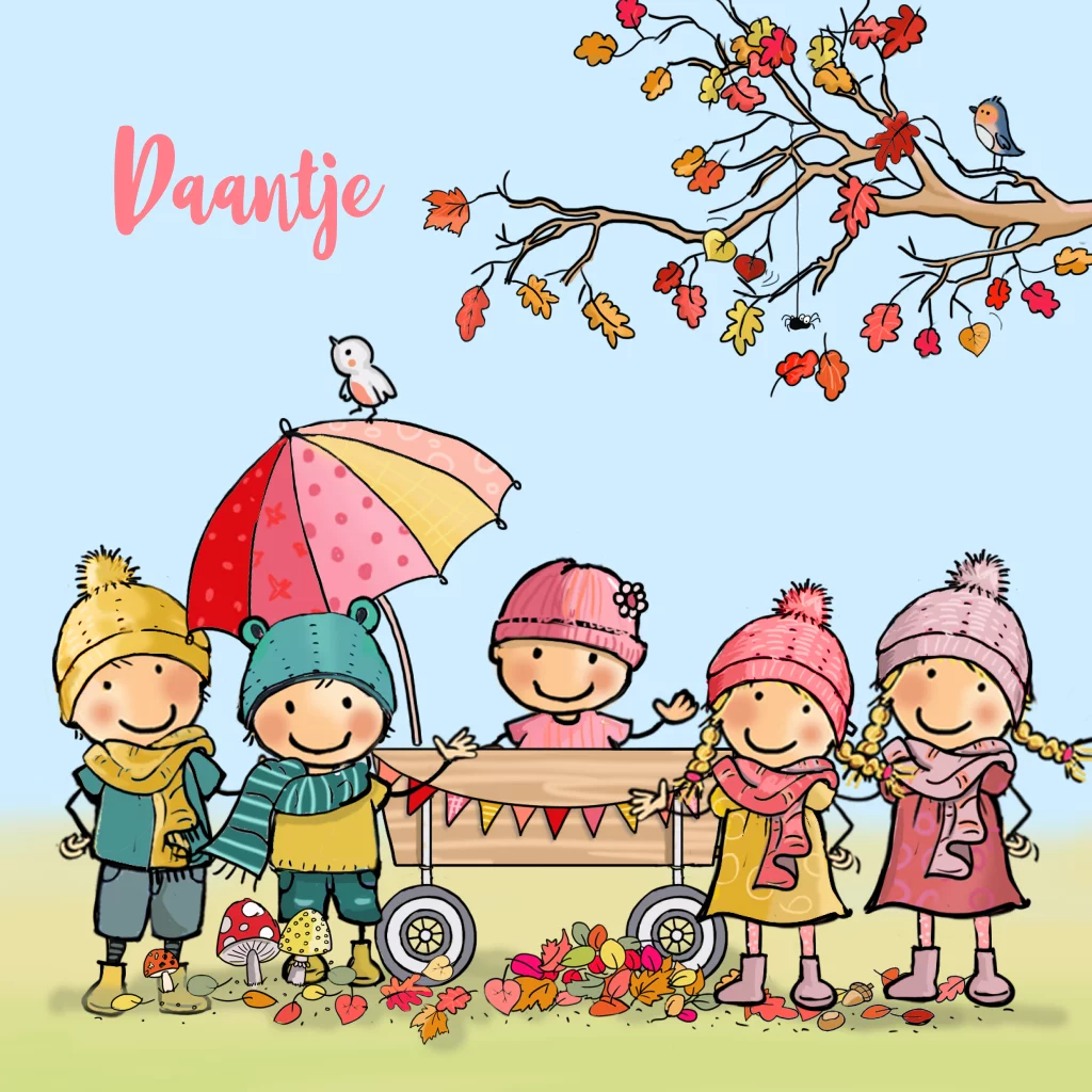 Leuk geboortekaartje voor een 5e baby meisje, 5e kindje in met herfst sferen thema kleuren. De kindjes zijn eenvoudig naar wens aan te passen in onze kaartenmaker. Onder "afbeeldingen en versieringen" vind je de verschillende kindjes. (7461)