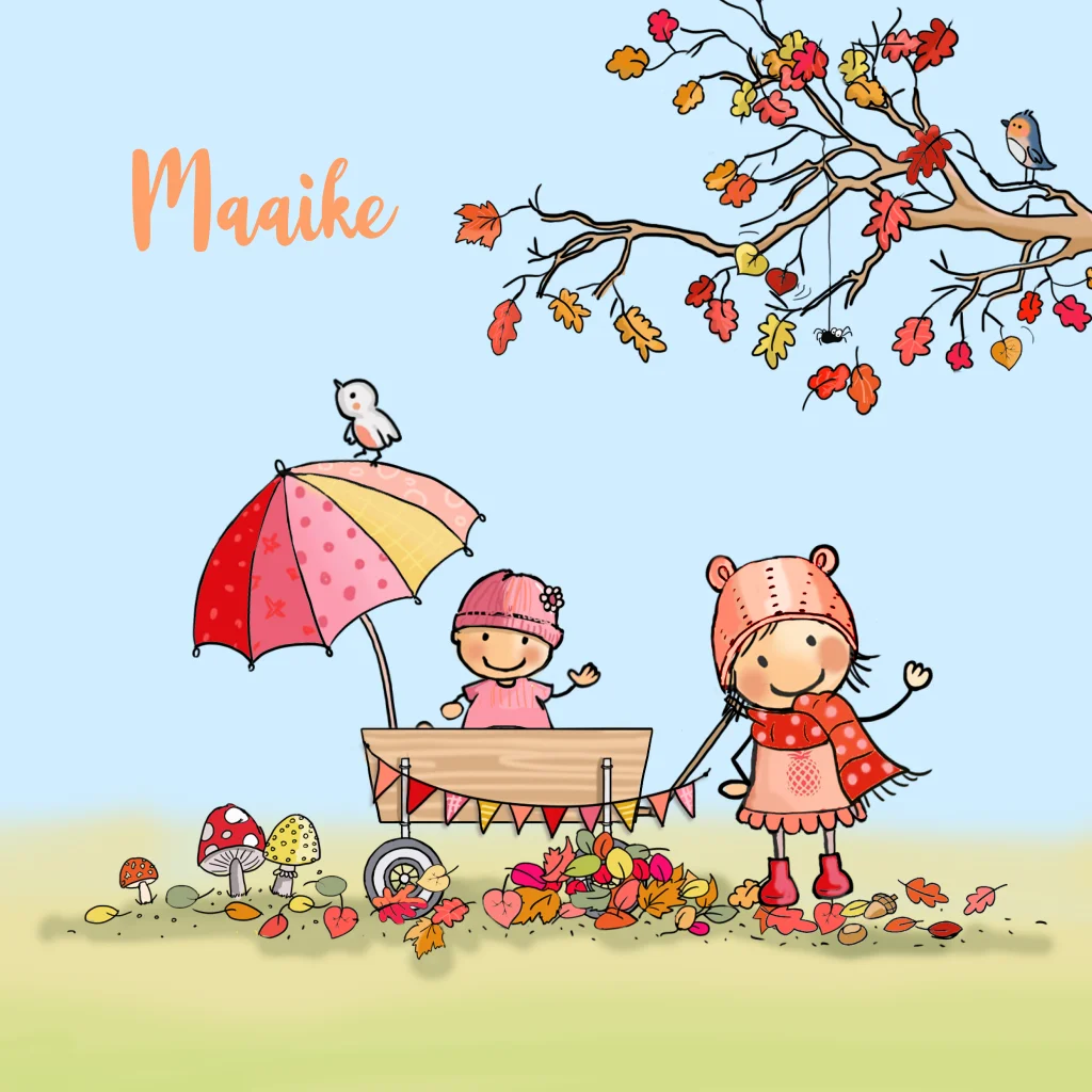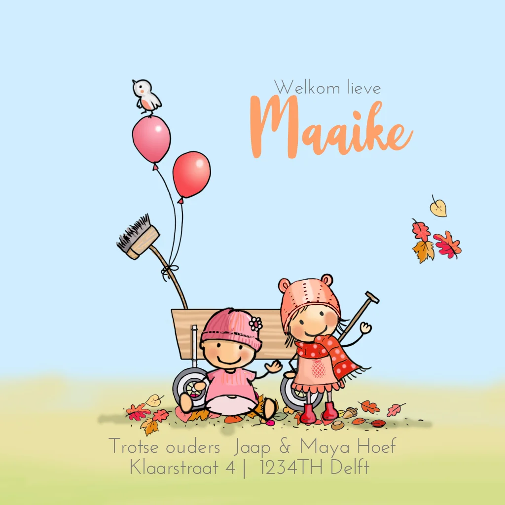 Mooi handgetekend 2de kindje geboortekaartje voor een baby meisje en grote zus in houten kar met herfstlandschap. Herfst geboortekaartje baby met paddestoelen en bladeren. De kindjes zijn eenvoudig naar wens aan te passen in onze kaartenmaker. Onder "afbeeldingen en versieringen" vind je de verschillende kindjes. (7463)